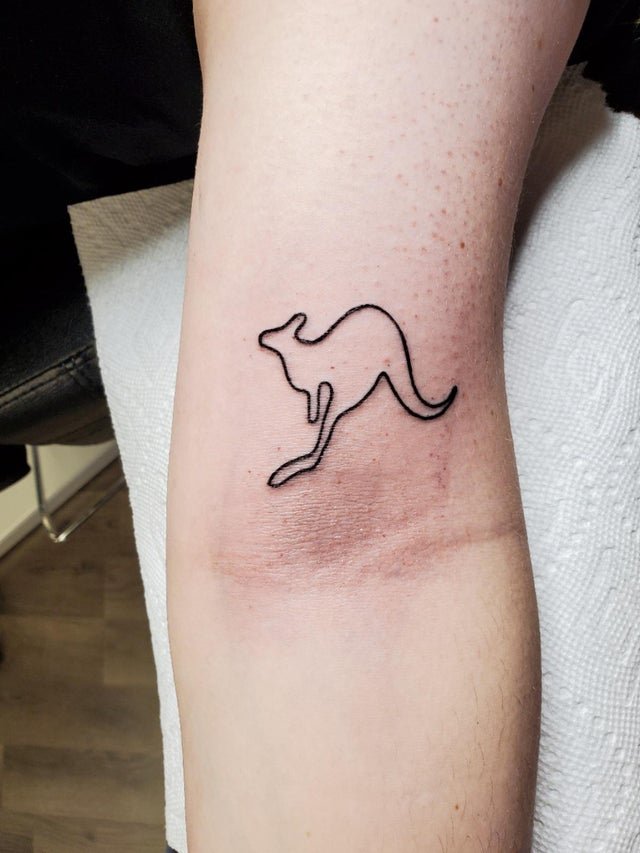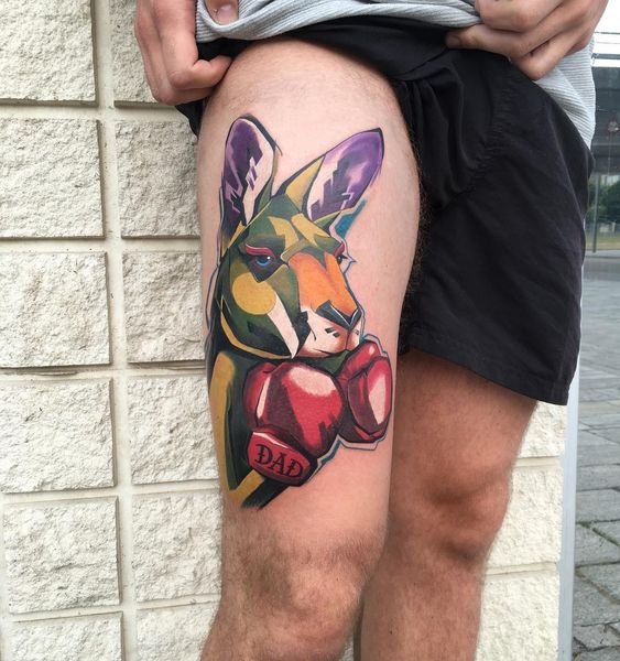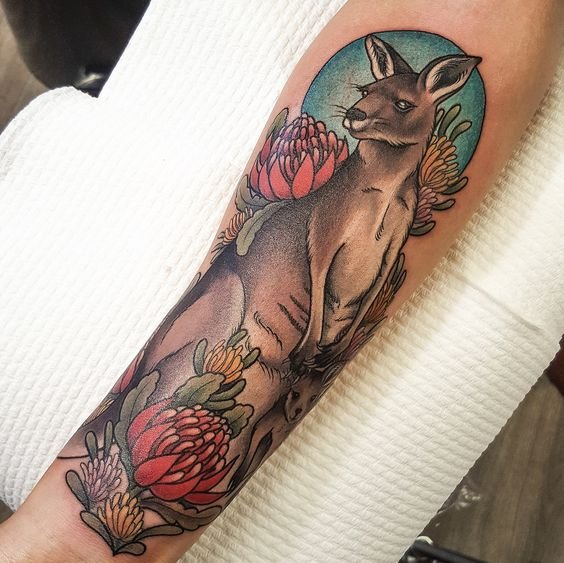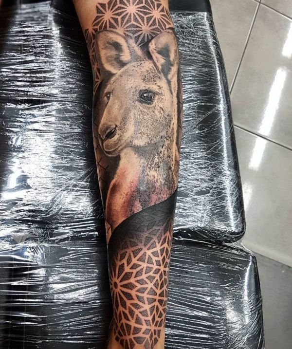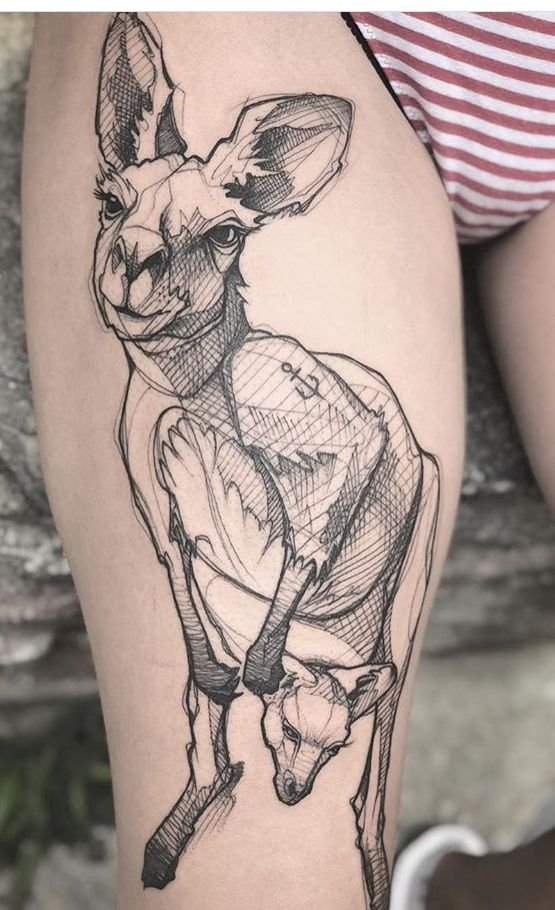 Достаточно высокое животное, обладающее большой силой, маневренностью, скоростью передвижения, кенгуру нравится и удивляет многих людей любого возраста. Представить себе что-то подобное сложно. Человек с тату кенгуру на коже будет так же выделяться своими внутренними и внешними чертами.