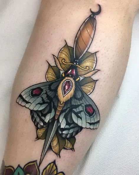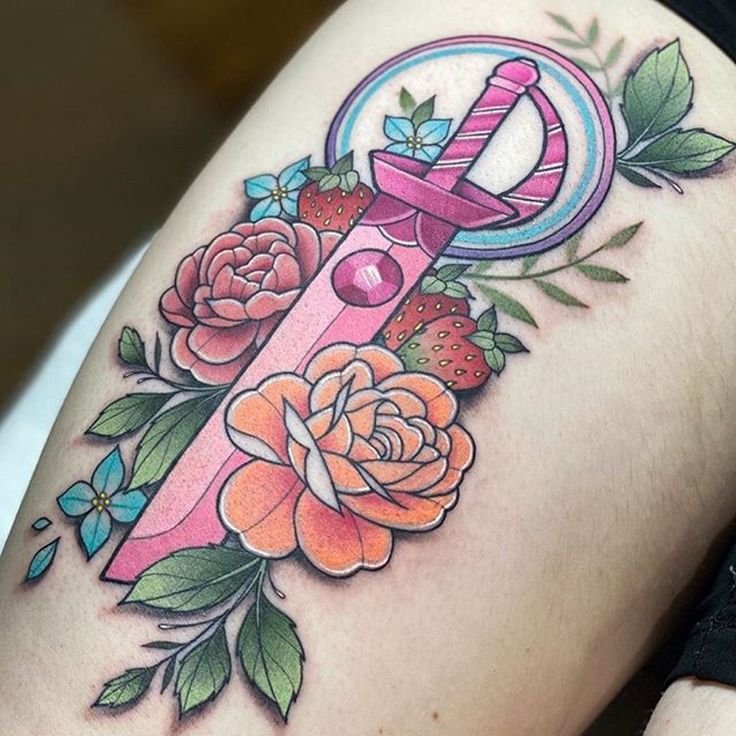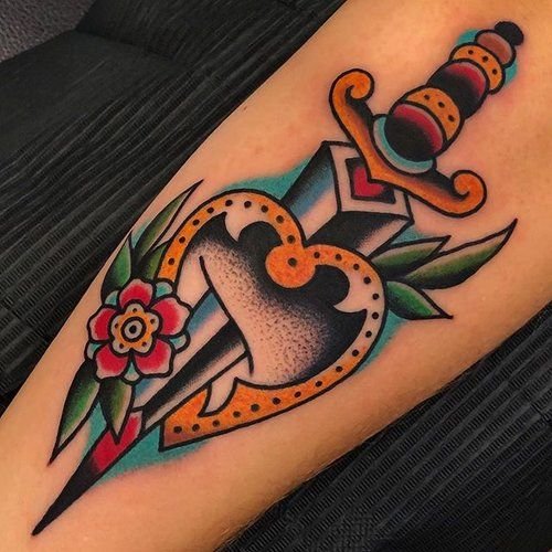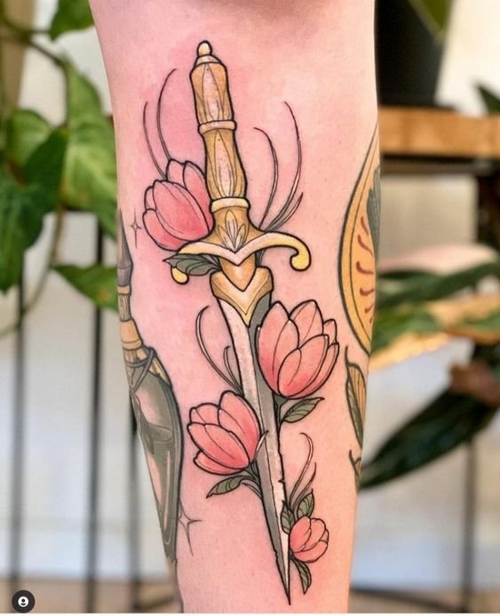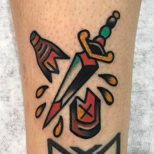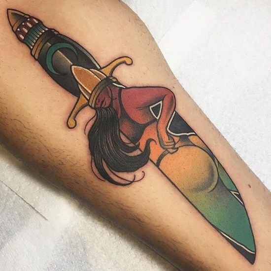Тату с кинжалом может быть исполнена в любой предпочитаемой цветовой гамме.