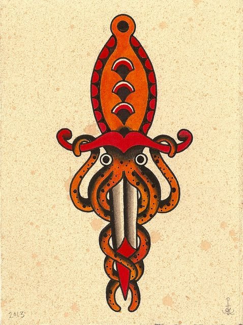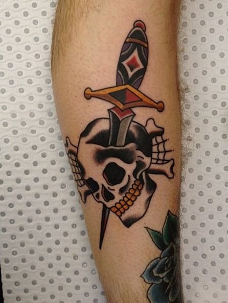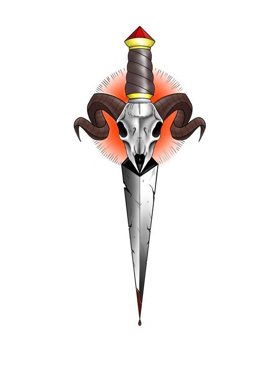 - Если на изображении кинжал находится в зубах черепа, такая татуировка обозначает что обладатель тату готов пустится во все тяжкие. Раньше такой рисунок украшал пиратский флаг, а также тела пиратов.