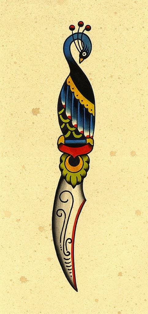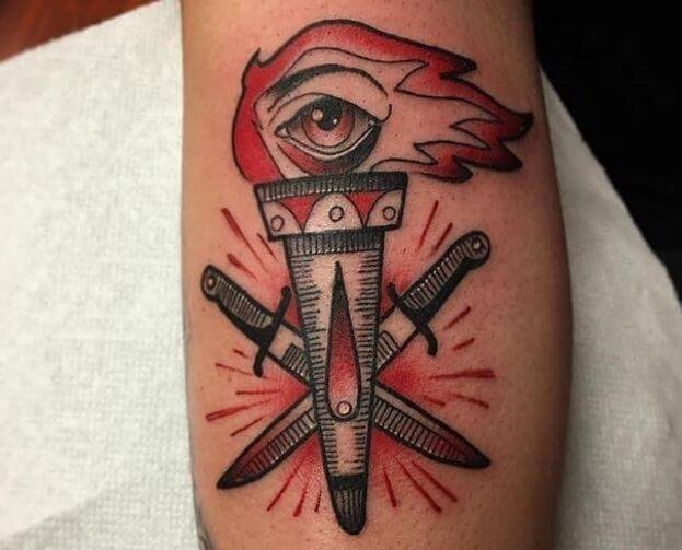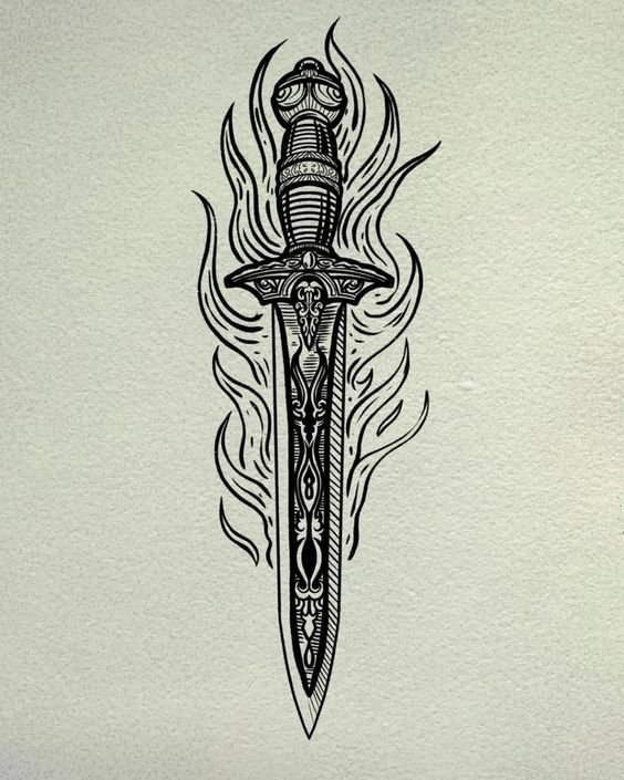Во времена средневековья, данное орудие выступало последней обороной в сражении. С помощью кинжала воин самостоятельно завершал свою жизнь, если в этом была необходимость, тем самым он сохранял свою честь. Поэтому в татуировках часто изображают кинжал, по лезвию которого стекает капля крови. Данный рисунок трактуется как бесстрашие и готовность при необходимости пожертвовать собой. Исходя из этого, тату кинжала больше относится к мужской категории, на женском теле такое изображение встречается крайне редко. Но это не единственное обозначение тату с кинжалом, есть еще несколько интересных трактовок, которые представлены ниже по тексту.
