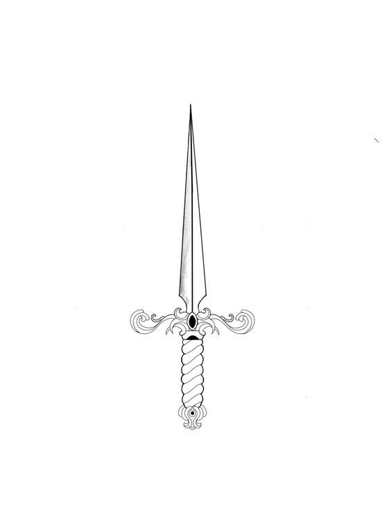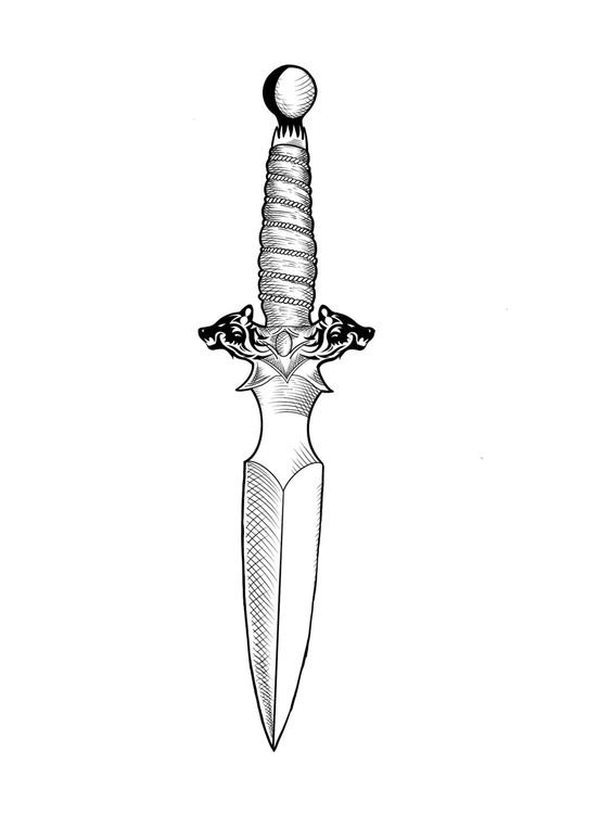 - Эскиз кинжала с черепом обозначает бесстрашие перед смертью, а так же служит защитой обладателя от нападения разбойников.