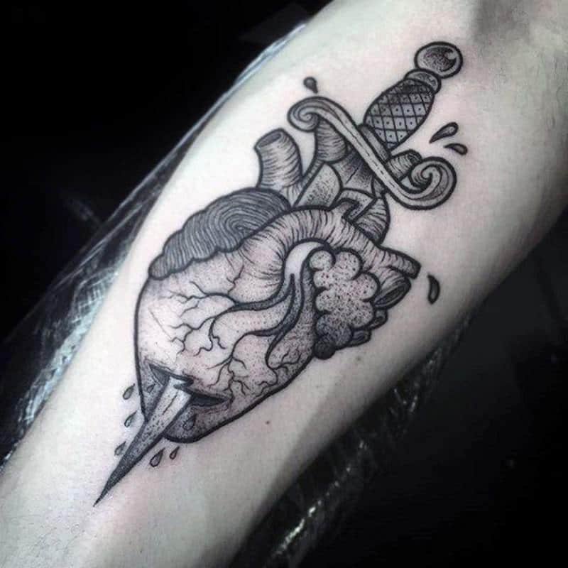 - Тату-эскиз кинжала пробивающего сердце несет в себе обозначение коварства, неверности дорогого человека. Так же такое изображение может выступать знаком мести и жестокости. Католическая религия связывает рисунок с сердцем Девы Марии.