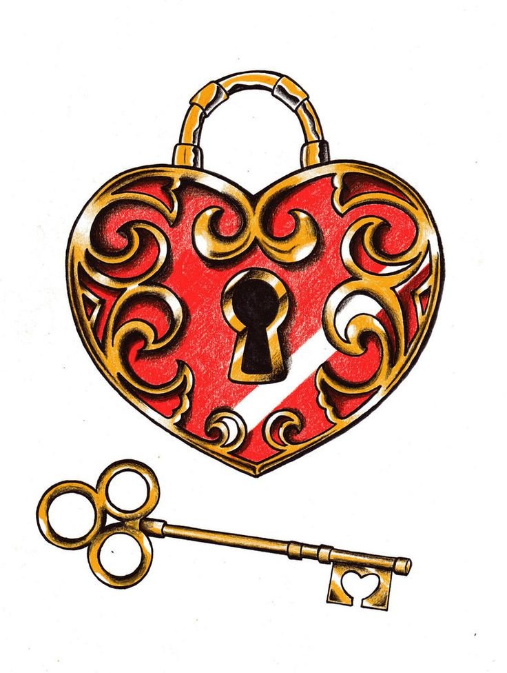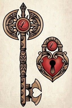 - Ключ, как правило, всегда имеет замок, который не открывает никакой другой ключ. Поэтому ключ довольно часто изображают в паре с замком. Как правило, данную татуировку часто выбирают влюбленные пары, в знак своей преданности и вечной любви. Ключ, в данном случае, обычно набивает себе парень, а девушка носит изображение замка (обычно в форме сердца).