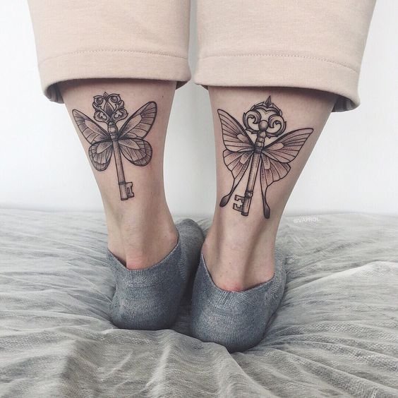 - Так же парной татуировкой является изображение двух, связанных лентой, ключей. Особо эффектно такое изображение смотрится, когда руки влюбленных соединены.