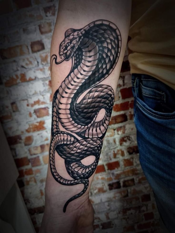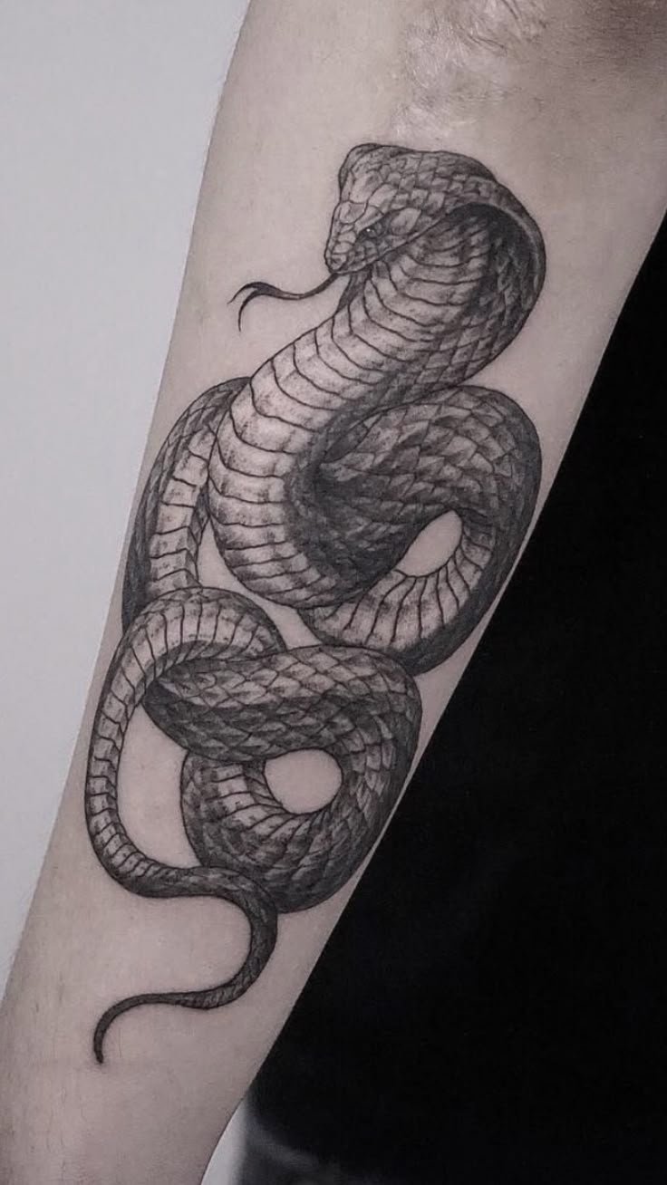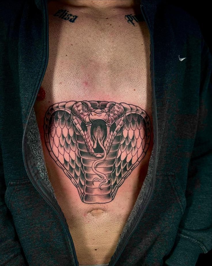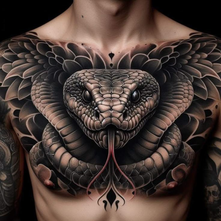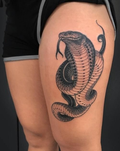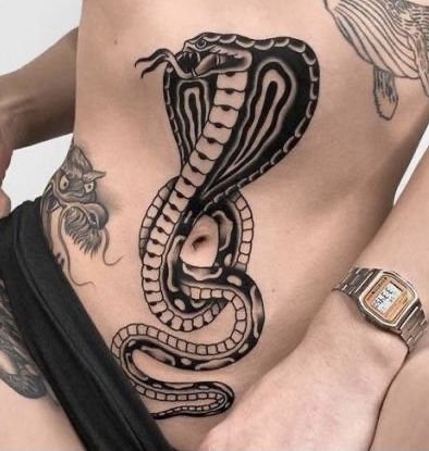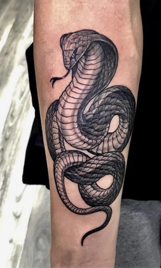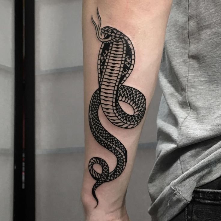 Образ кобры в тату-культуре символизирует мощь, решительность и контроль над ситуацией.