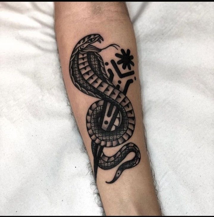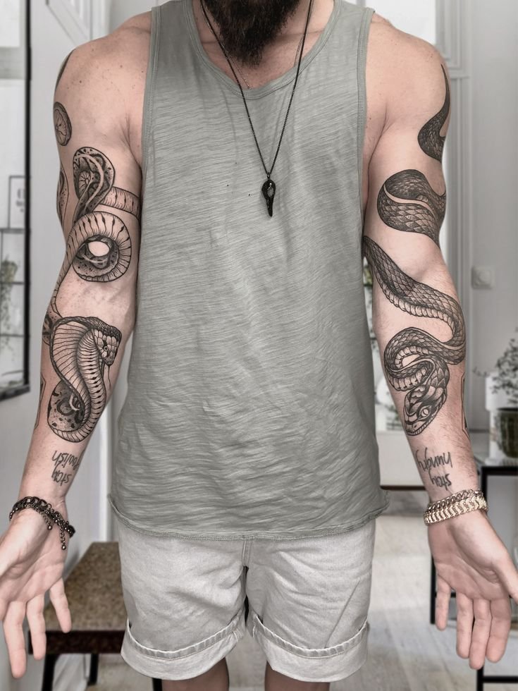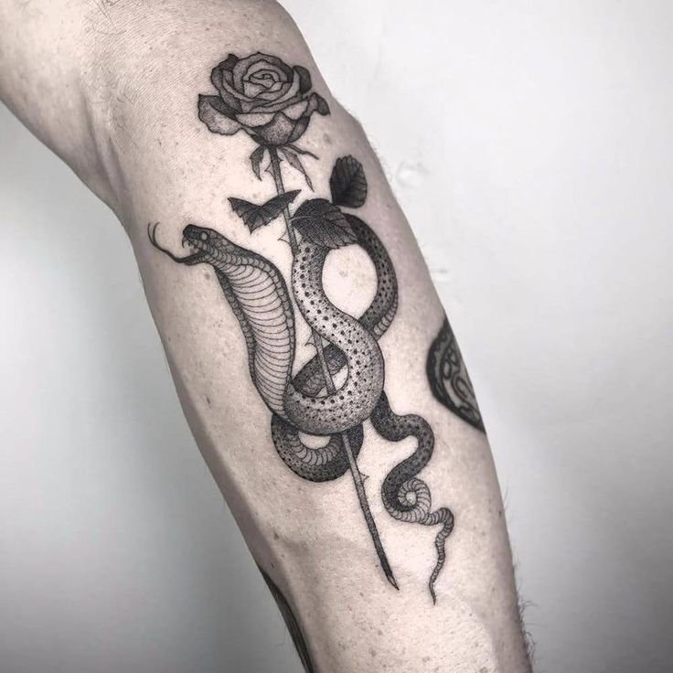 Изображение змеи можно дополнить элементами, такими как кинжал, череп, цветы, руны или огонь, создавая уникальную композицию.
