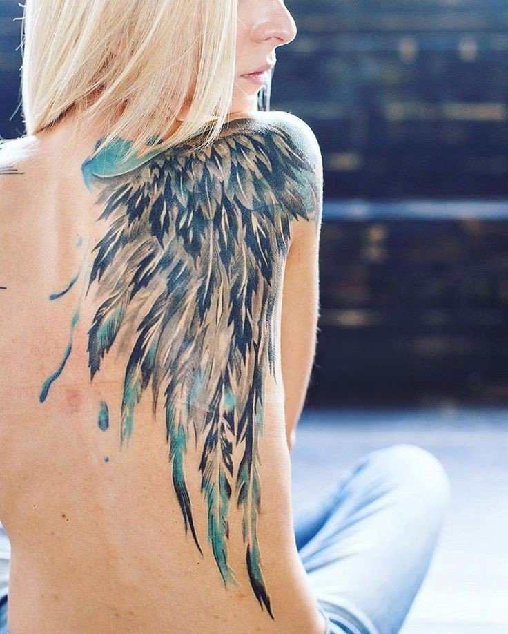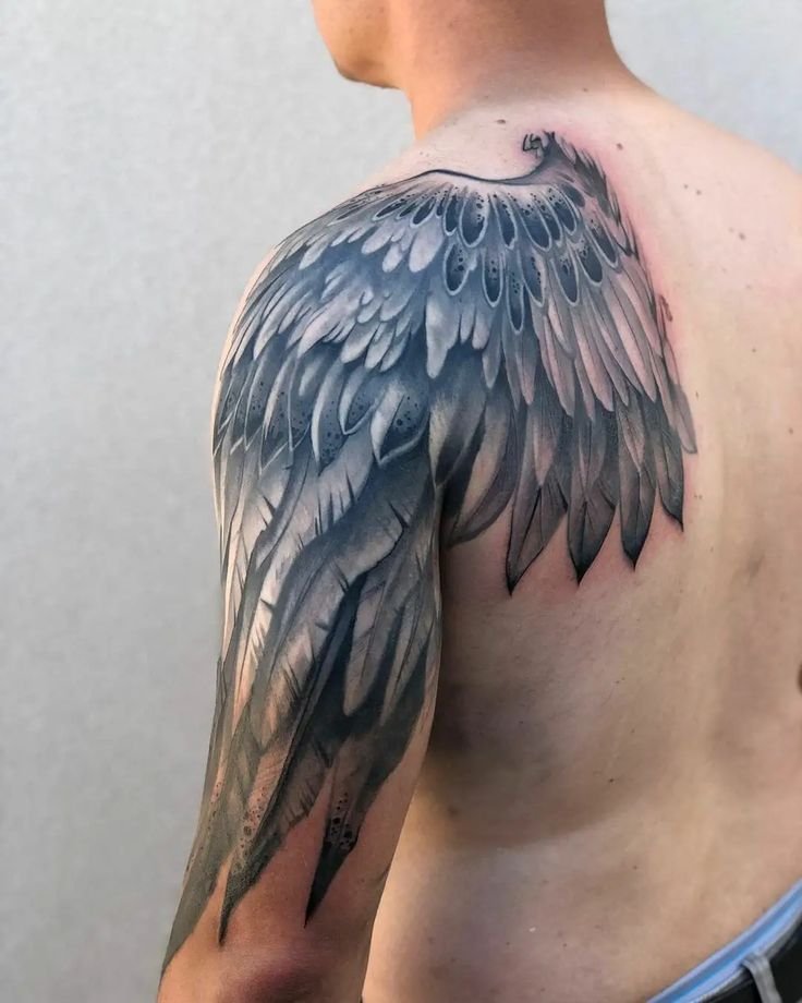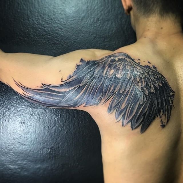Что касается мужской части, тату крыльев обычно изображается в однотонной цветовой гамме с симметричным расположением. У мужчин крылья чаще всего располагаются на спине, либо на самих лопатках.