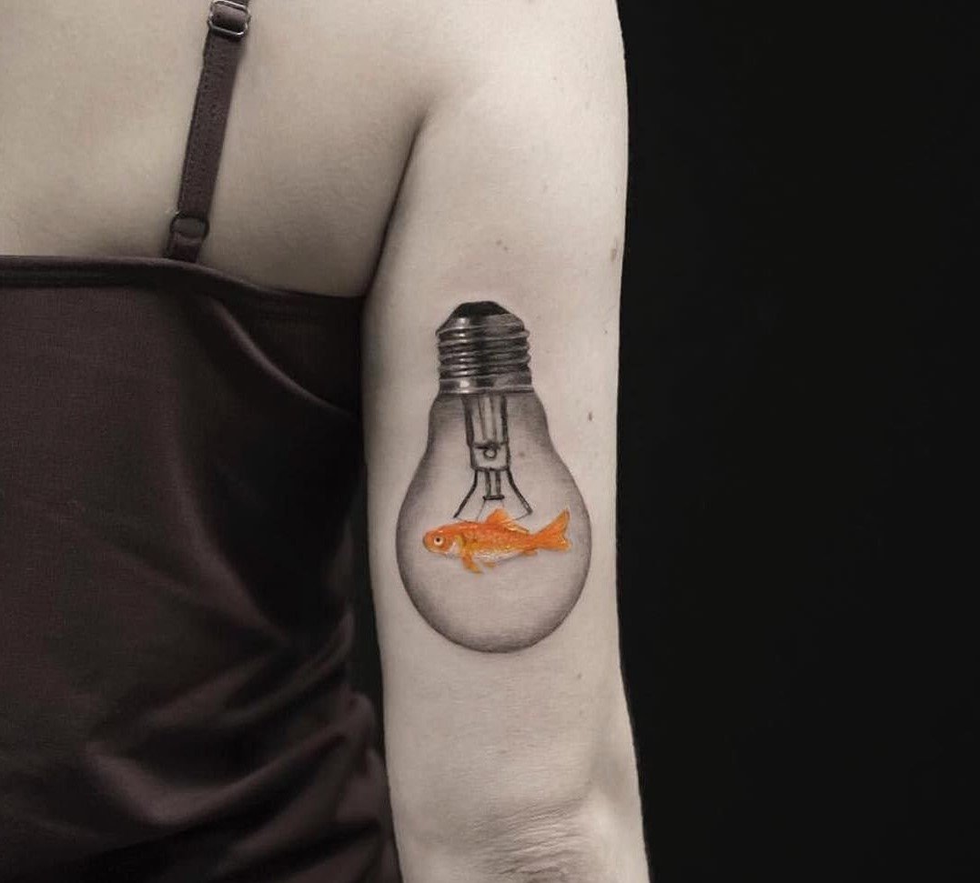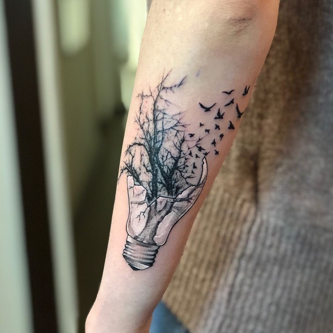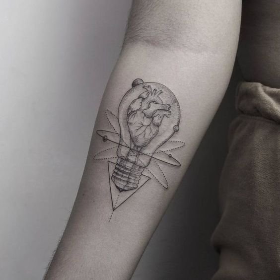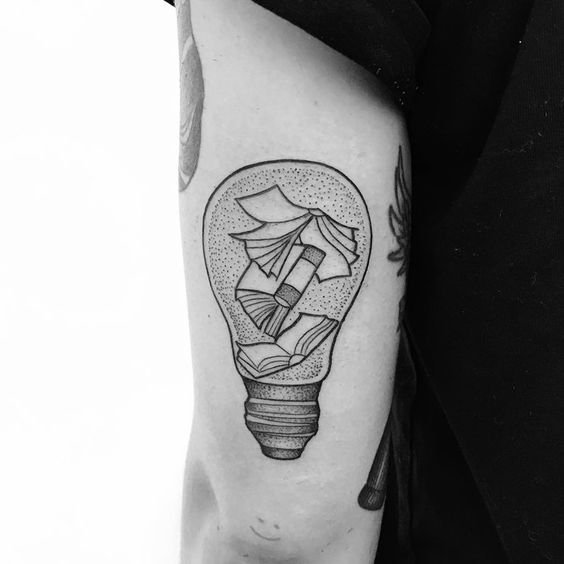 Изображение лампочки будет самым обычным, с желтым свечением, потому и тату можно выполнить в подобной манере. Тату будет подходяще мыслителям, задумчивым людям, ученым, студентам точных наук. Нельзя сказать, что идея лампочки обходит гуманитарные направления, но все же, технически больше свойственна точным наукам.