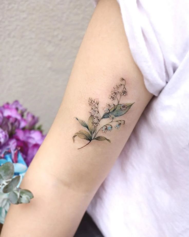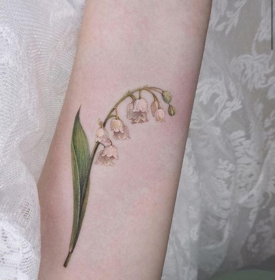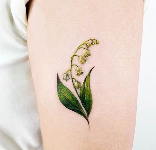 - Реалистичный ландыш. Детализированная татуировка, которая будет выглядеть как настоящая веточка ландыша, идеально подойдет для предплечья, спины или бедра.