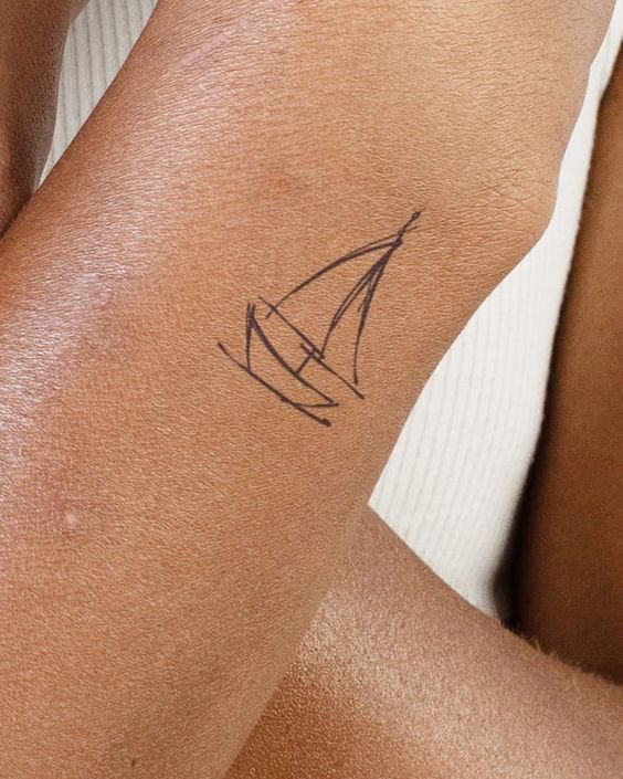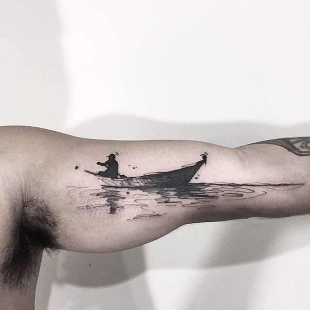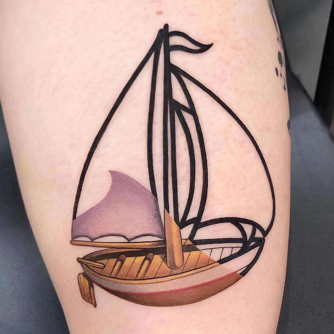 Лодка, набитая на коже клиента, означает любовь к приключениям и авантюризм, они сопутствуют заказчику во всех делах.