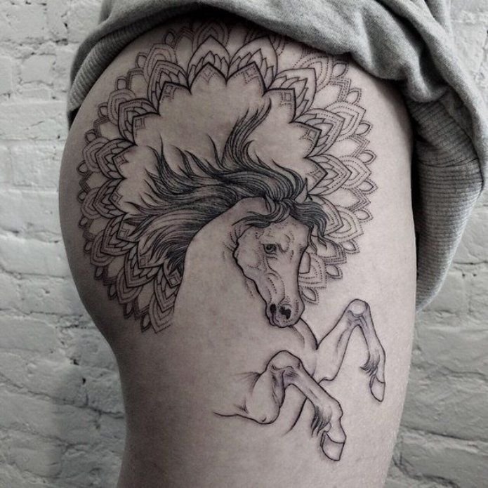 При выборе татуировки с изображением лошади помните, что такое изображение любит большие плоскости (спина, плечи, грудь, бедра либо боковая часть тела), так лошадь будет смотреться очень красочно, невероятно красиво и эффектно.