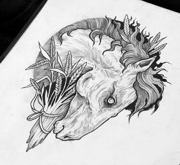- Немного пугающе выглядит тату с черепом лошади, но несет оно в себе лишь положительные качества, такое изображение служит оберегом для своего обладателя.