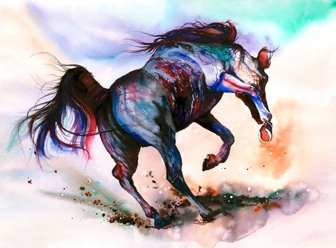 - Если лошадь изображена в светлых тонах, значит изображение наполнено положительной энергией. Часто такой скакун изображается в процессе бега, с пышной гривой которая развивается на ветру.