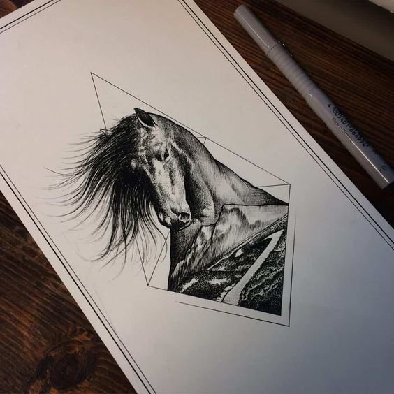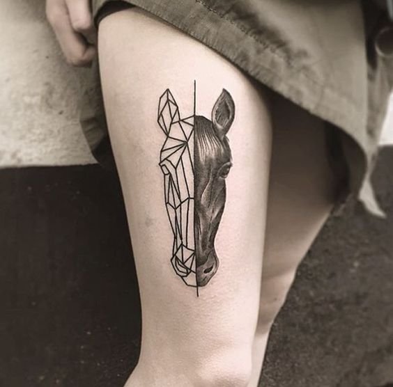 - Лошадь исполненную в схематическом изображении это редкость, данная татуировка показывает что ее обладатель весьма оригинальная и интересная личность.