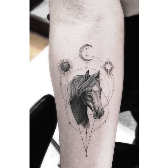 В основном изображение этого потрясающего животного выбирают люди наделены оптимизмом, большой энергией, которые сильны и телом и душой. В мифах различных народов лошадь имела несколько обличий. У одного народа лошадь выступала в качестве солнечного животного, у других конь олицетворял луну, часто лошадей связывали со стихиями воды и огня. Так же считалось что эти прекрасные животные служили богам в качестве скакунов, многие верили что лошади являются перевозчиками душ в иной мир.
