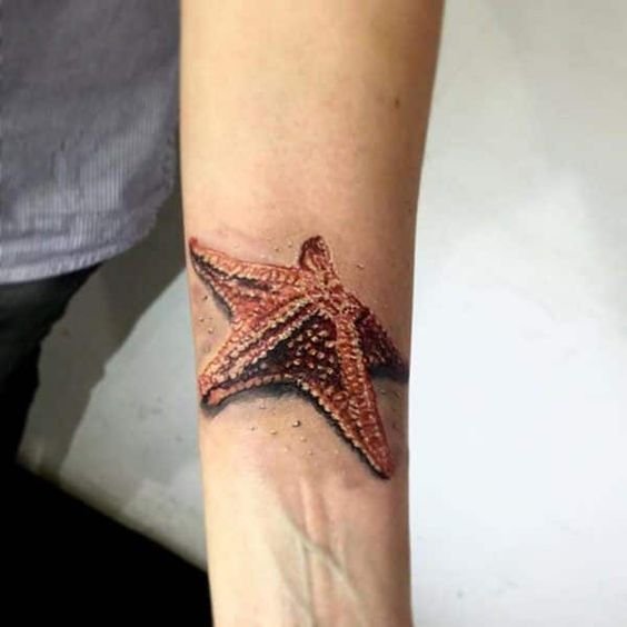 Широким спросом пользуются татуировки пятиконечной звезды выполненной в стиле реализма. Часто в таких изображениях встречаются дополнительные элементы морской тематики. К примеру, тату морской звезды может быть дополнено водорослями или различными камнями. Так же в изображение можно добавить различных рыбок и прочих морских обитателей.