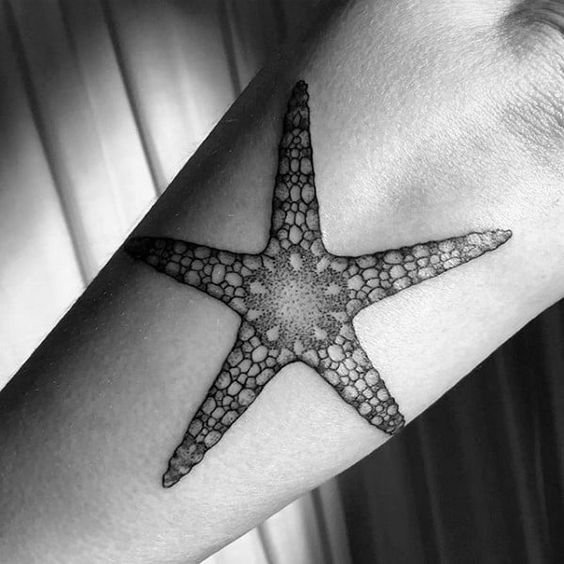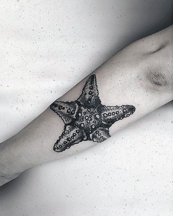 Парни выбирают более масштабные изображения морских звезд, украшая им предплечье, плече, спину или голень.
