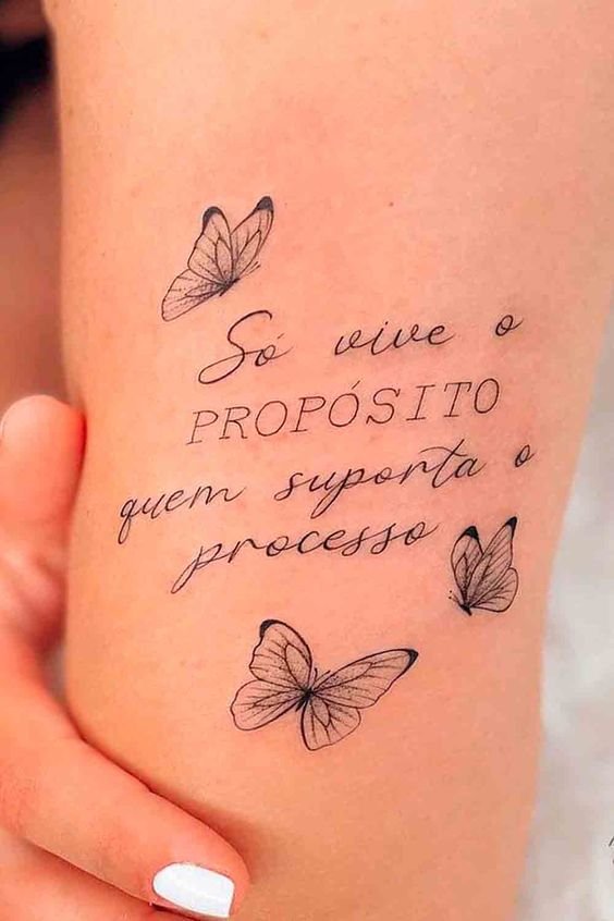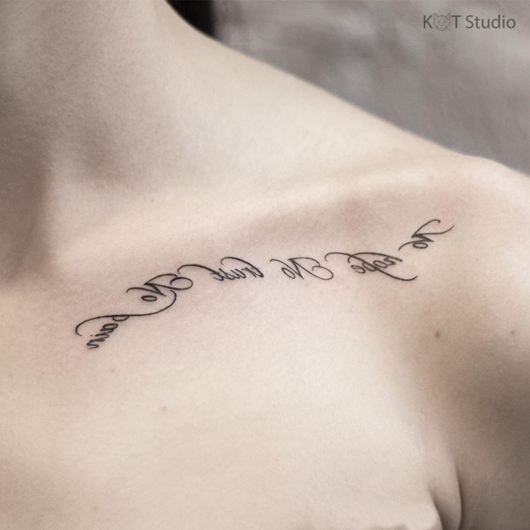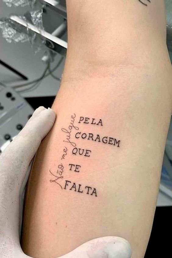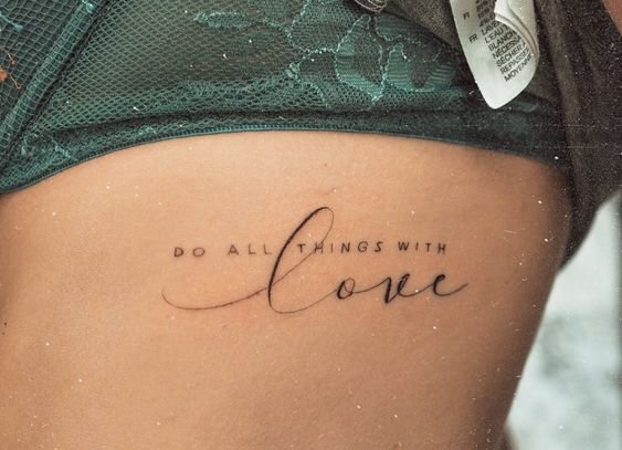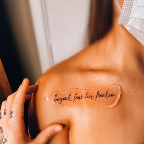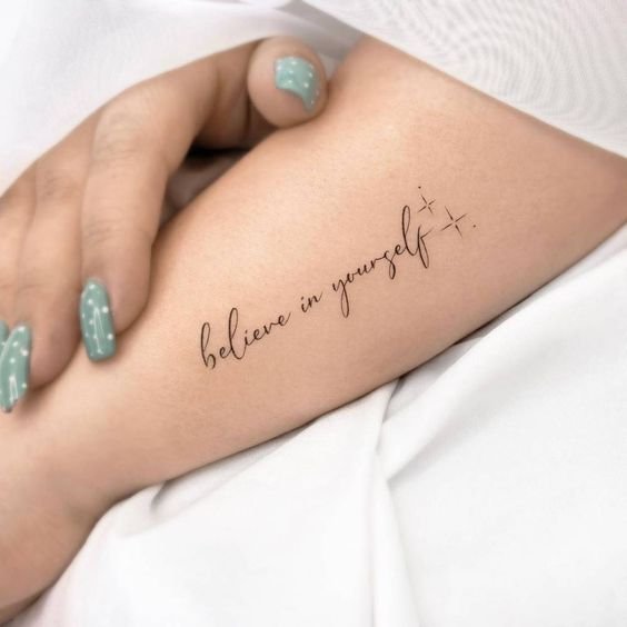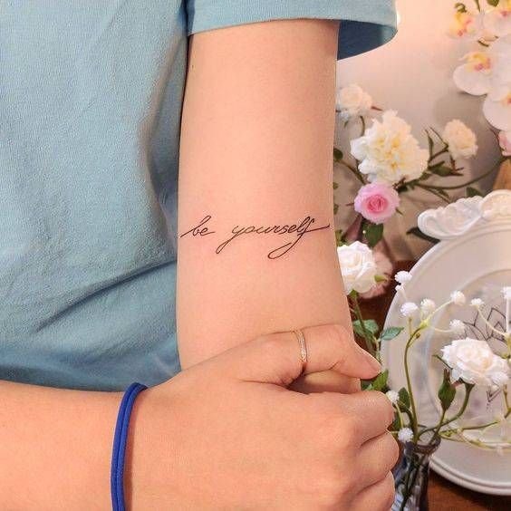 Часто для тату выбираются любимые цитаты из книги, песни, или кинолент. Как правило, выбранная цитата несет в себе особое значение для человека, таким образом на теле увековечивается не только фраза, но и ощущаемые в тот момент эмоции человека.