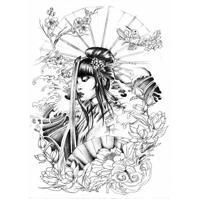 - Часто гейш изображают с зонтиками или веерами в руках, чтобы передать всю красоту девушек, ведь гейша, прежде всего, творила искусство. Другой вариант рисунка это гейша с обнаженными плечами. Тогда владелица татуировки стремится подчеркнуть также свою сексуальность.