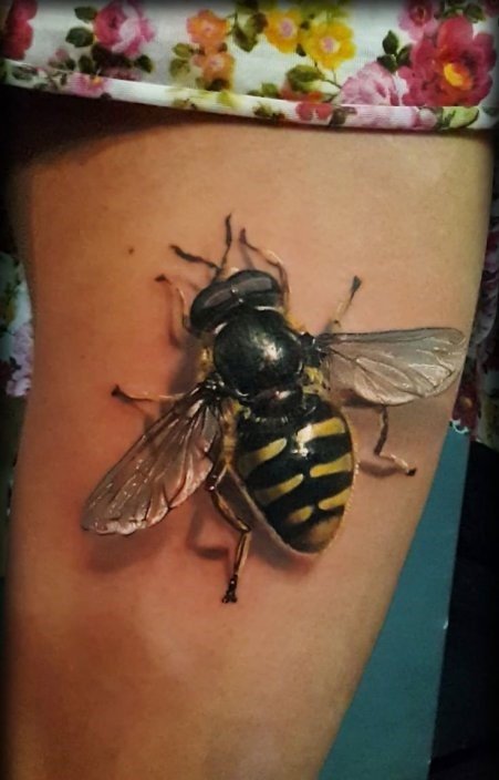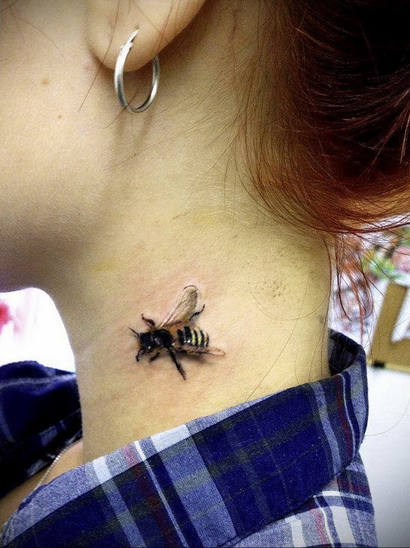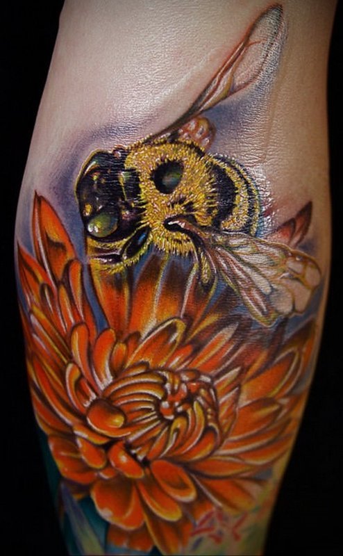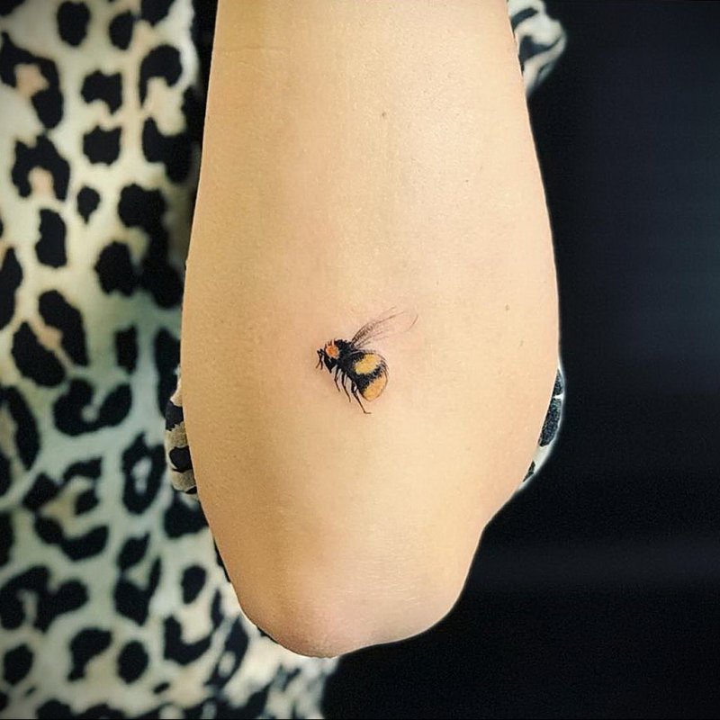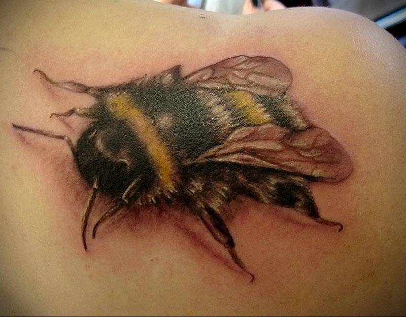 - Разноцветные татуировки пчел выглядят эффектно и впечатляюще, поскольку их природный окрас сам по себе довольно интересен. А комбинация черного и желтого цветов – это всегда удачный выбор.