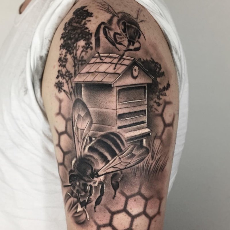 Тот факт, что рабочие пчелы погибают после того, как они ужалят врага во благо пчелиной матки и улья, также ассоциируют с жертвенностью и преданностью. Между тем, благодаря невероятно изящному дизайну сот, еще одно значение татуировки пчел – это невероятная эстетика, структурированность и развитый коллективный интеллект. Такой боди-арт отлично подойдет светлым и оптимистичным людям.
