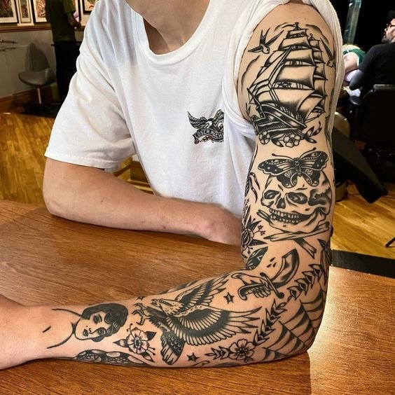 Историю татуировок в стиле пэчворк можно проследить до времен, когда моряки пигментировали свое тело в память о путешествиях и приобретенном опыте.