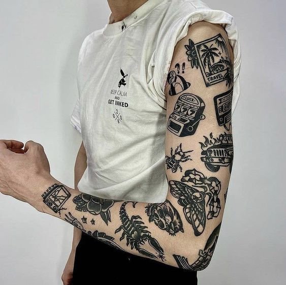 На самом деле - это метод размещения эскизов на теле. Когда большинство людей делают рукав, у них получается одно большое и цельное полотно. Тогда как пэчворк является техникой лоскутного расположения маленьких и средних по размеру татуировок, которые плотно подгоняются друг под друга, но при этом не касаются. Иначе говоря, это куча маленьких картинок, собранных в коллаж с небольшим пустым пространством между ними, подобно заплаткам на джинсовой куртке. Им не обязательно нужна тема, которая бы объединяла тату. И обычно нет фона, который бы заполнял пространство. Визуально это похоже на то, будто каждая татуировка - это стикер или заплатка, приклеенная к вашему телу.