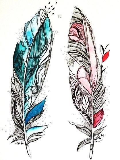 Тату с пером бывают двух видов: первое, это перо выполнено в индейской тематике, второе - изображения самых разных перьев различных птиц.