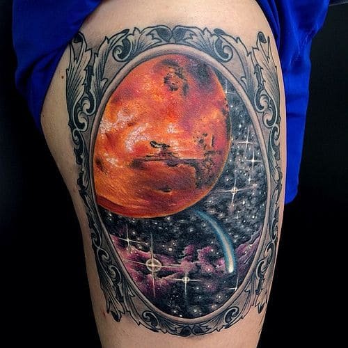 - Татуировка Марса символизирует дерзость, вспыльчивость и резкий темперамент человека. Набивают тату с изображением планеты Марс на своем теле, скорее всего активный и деятельный человек, тем самым он выгодно подчеркнет свой нрав. Также эскиз тату планеты Марс является хорошим выбором для мужчин которые просто хотят украсить свое тело этой воинственной и загадочной планетой.