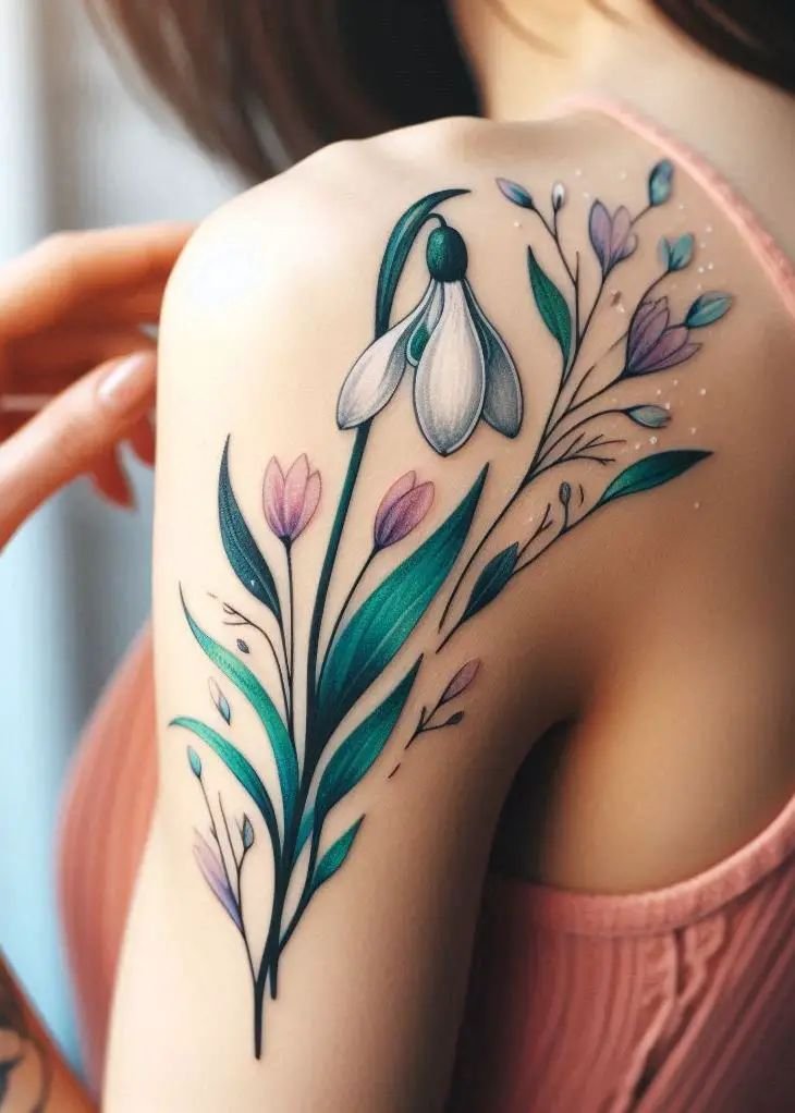 - Если вы хотите добавить яркости в свою татуировку, акварельный стиль с подснежниками станет отличным решением. Тонированные плавные переходы цветов — от нежных розовых и фиолетовых до светло-зеленых оттенков — создадут ощущение лёгкости и воздушности.