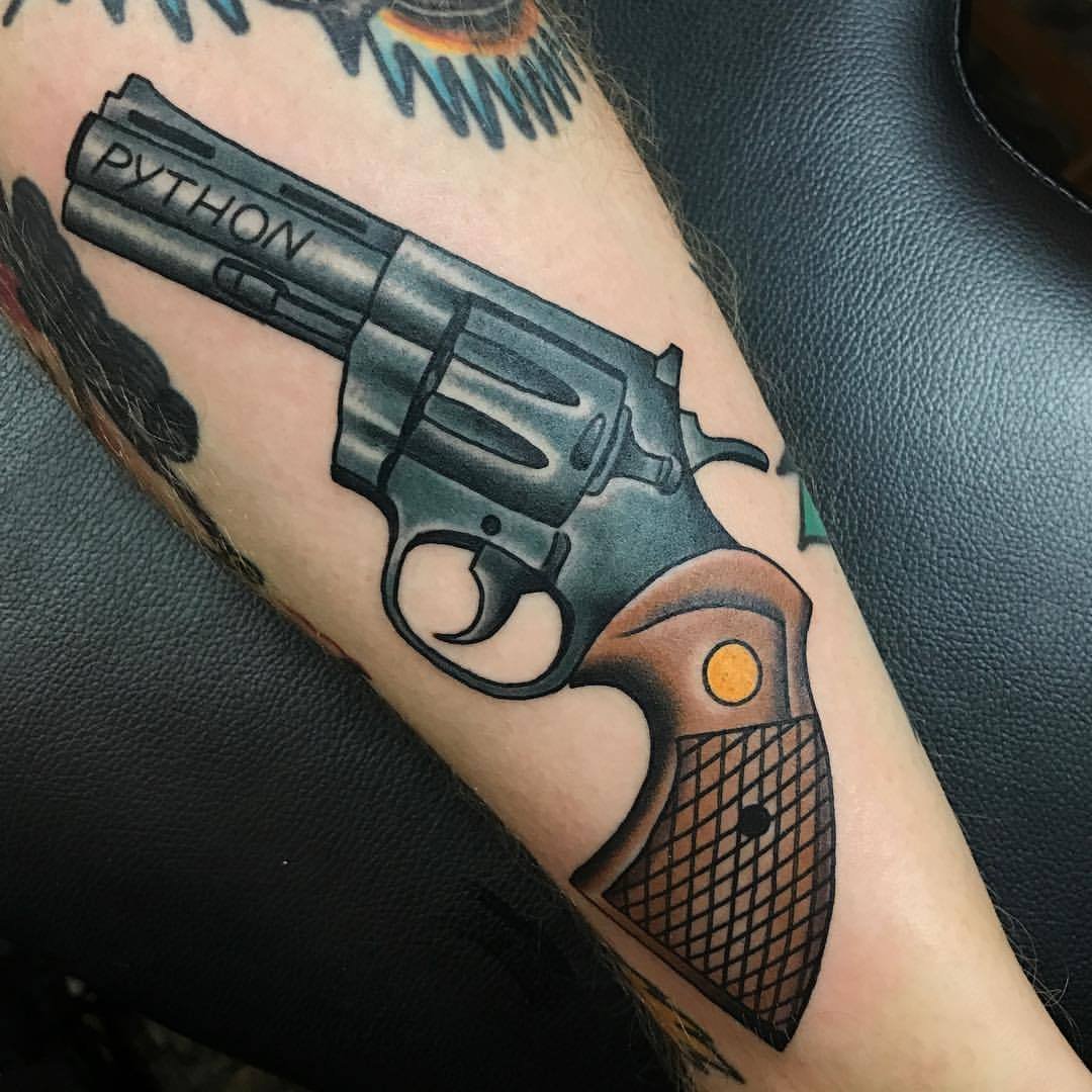 Для тату чаще всего выбирают изображения таких револьверов как Кольт, Спиллер Энд Барр и Ремингтон. Последний вариант используется в эскизах довольно редко. Нательное изображение револьвера выглядит очень привлекательно, и несет в себе обозначение холодного расчета и мощи.