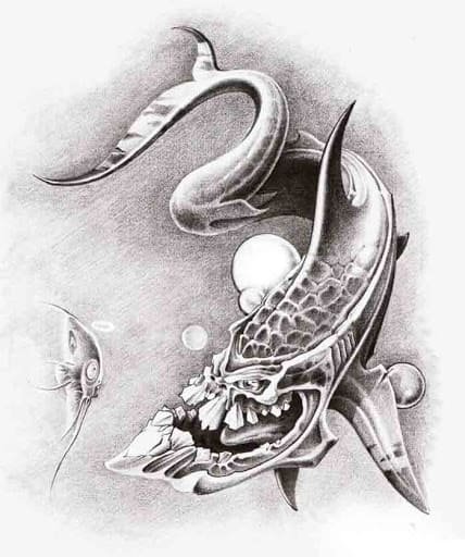 Но также это может показывать о жадности и глупости. Тату эскиз рыба относится как и к женским, так и к мужским татуировкам. Татуировки групп рыб могут свидетельствовать о стремление идти впереди и развивать себя.