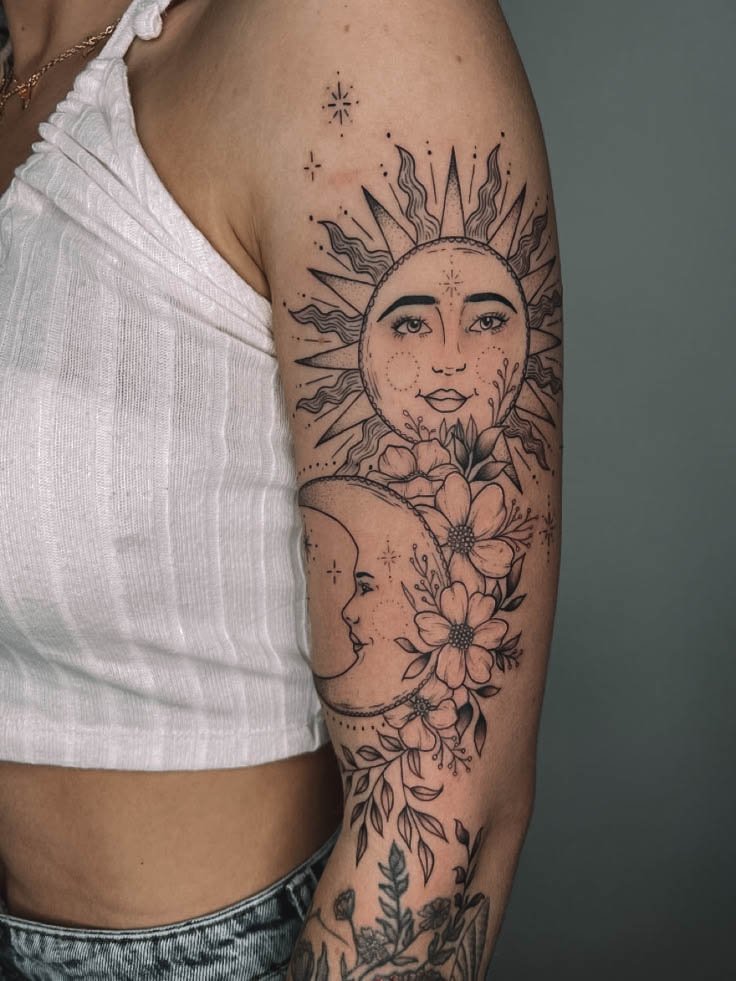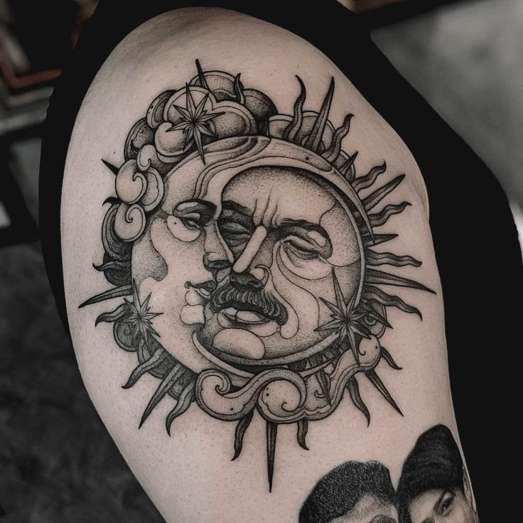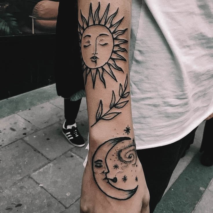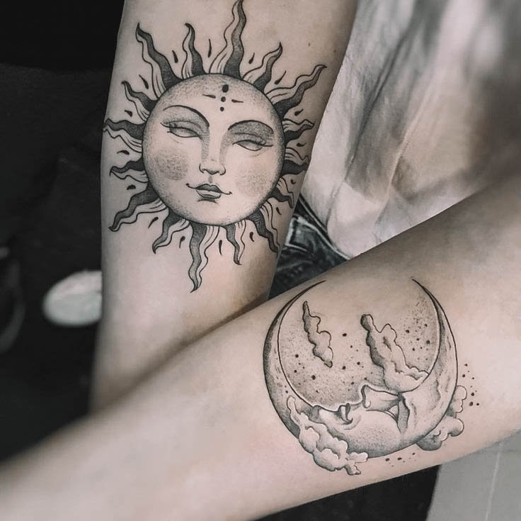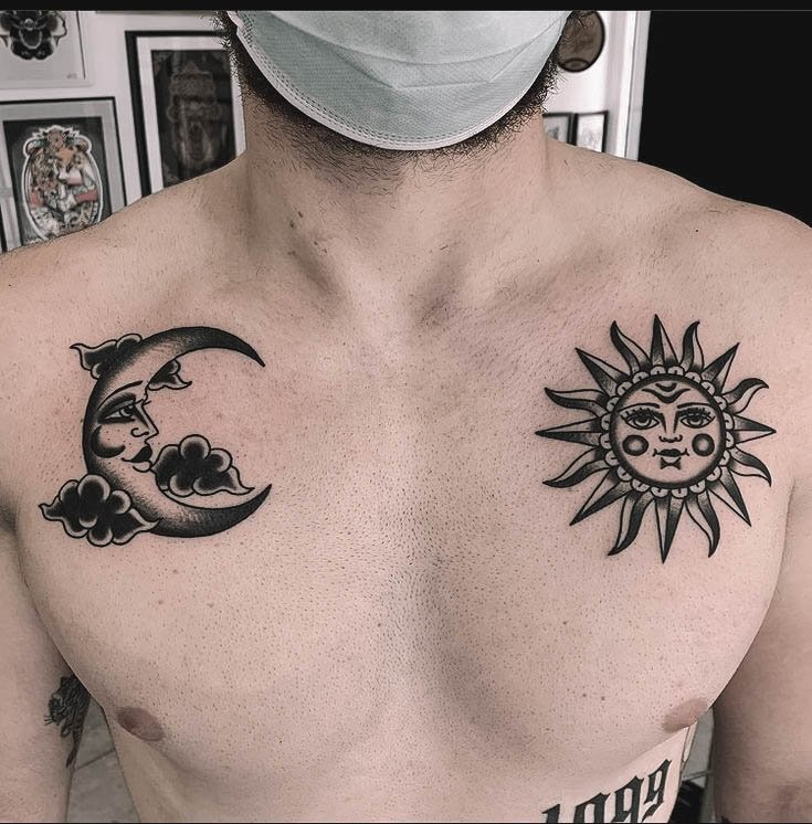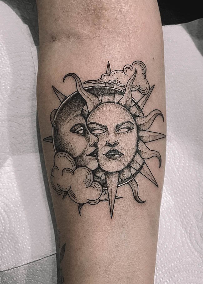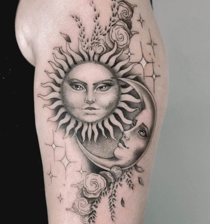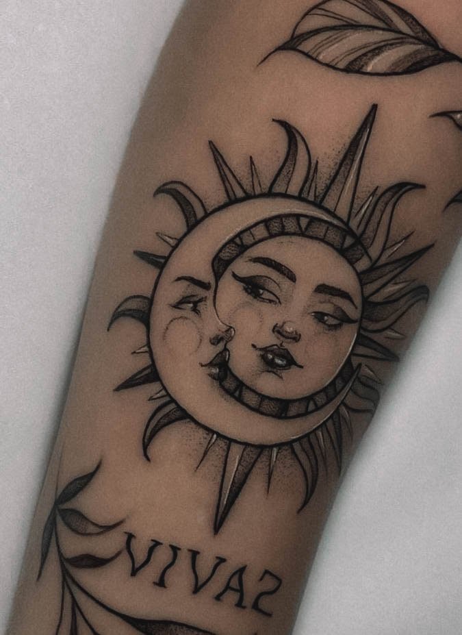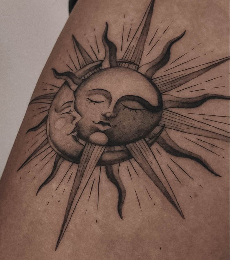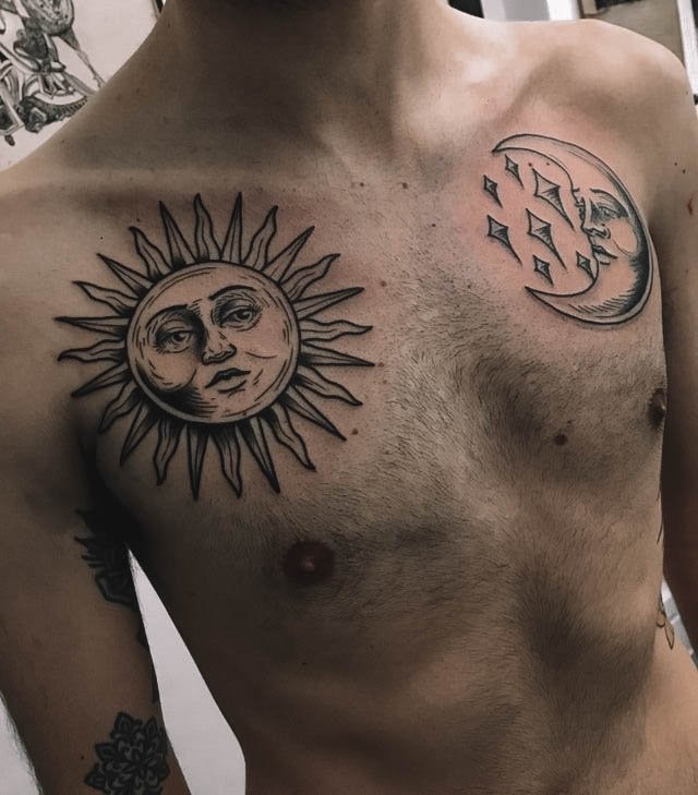 Татуировка с изображением Солнца и Луны символизирует единство противоположностей: света и тьмы, мужского и женского начала, дня и ночи.