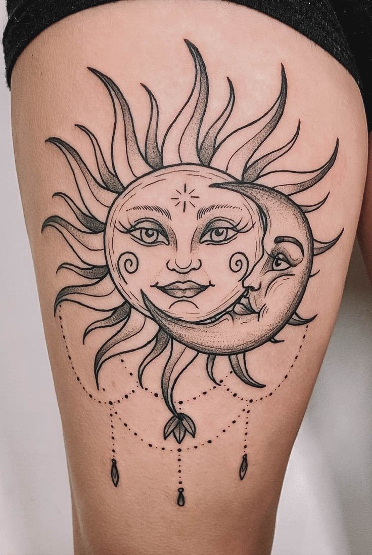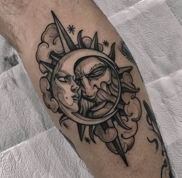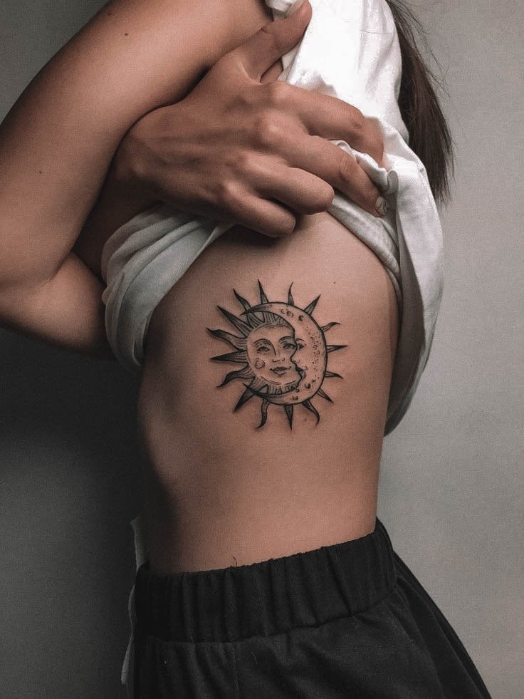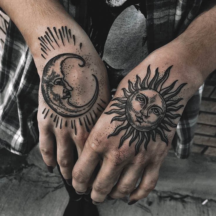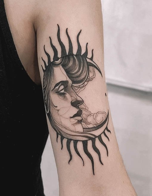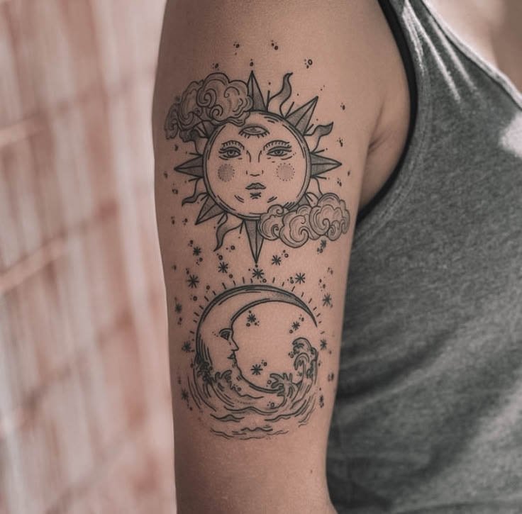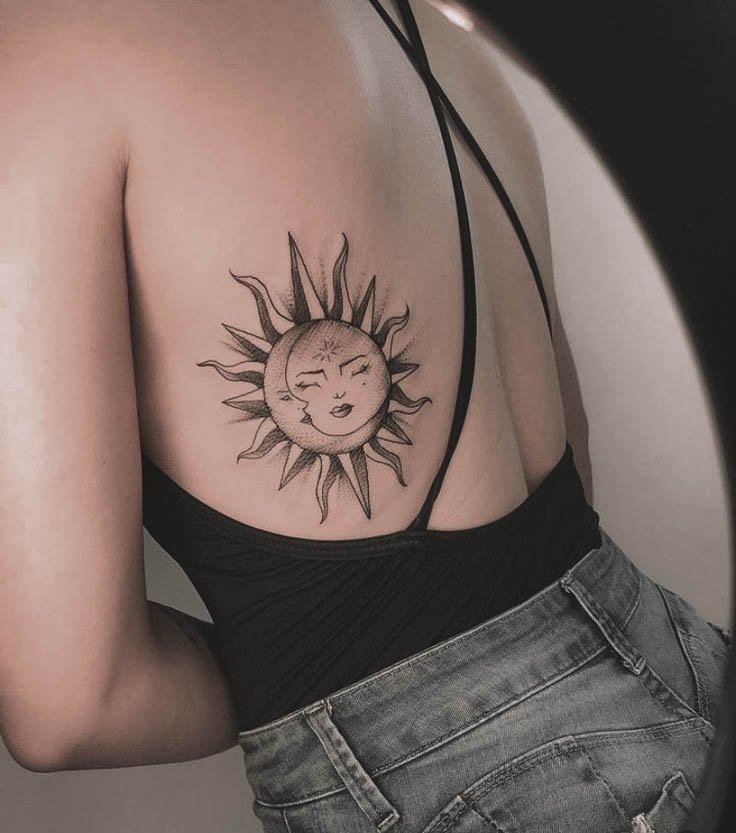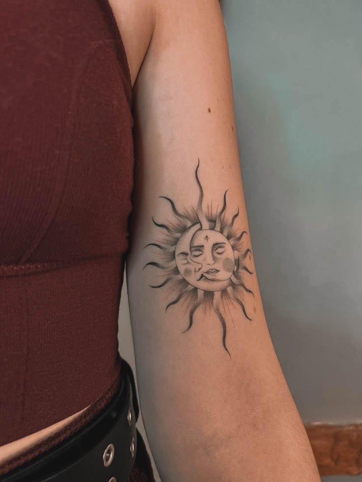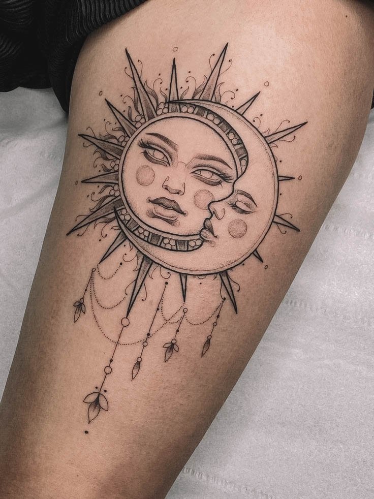 Татуировка с изображением Солнца и Луны символизирует единство противоположностей: света и тьмы, мужского и женского начала, дня и ночи.