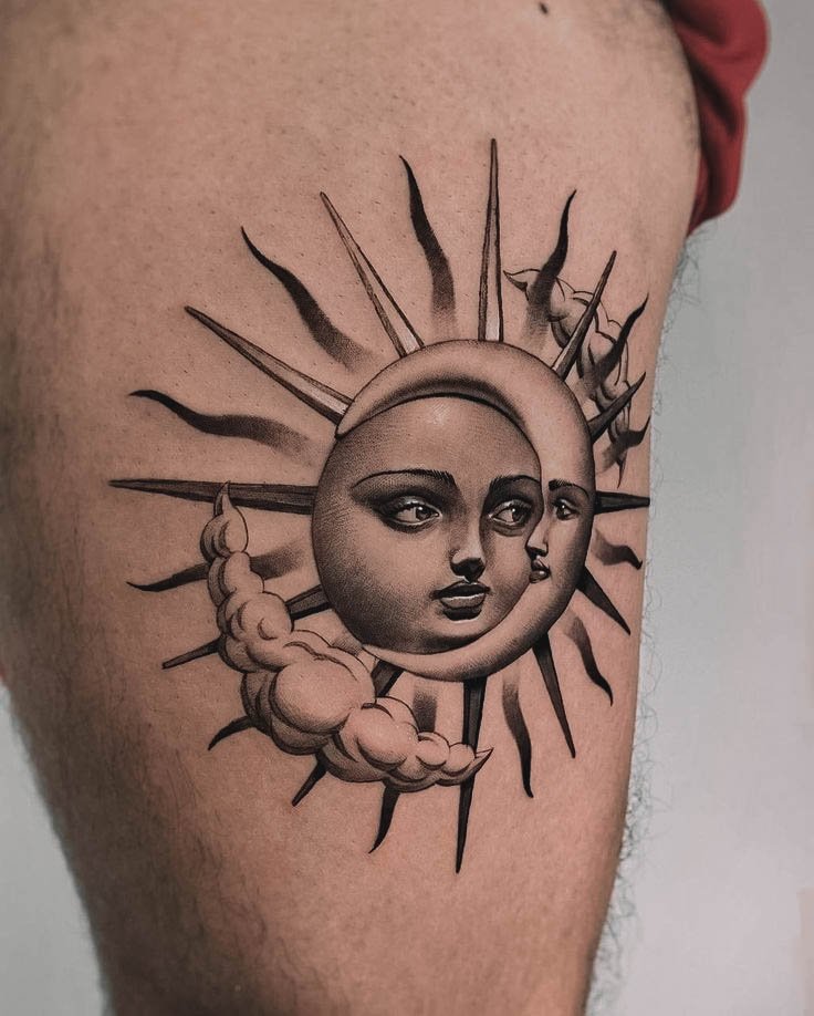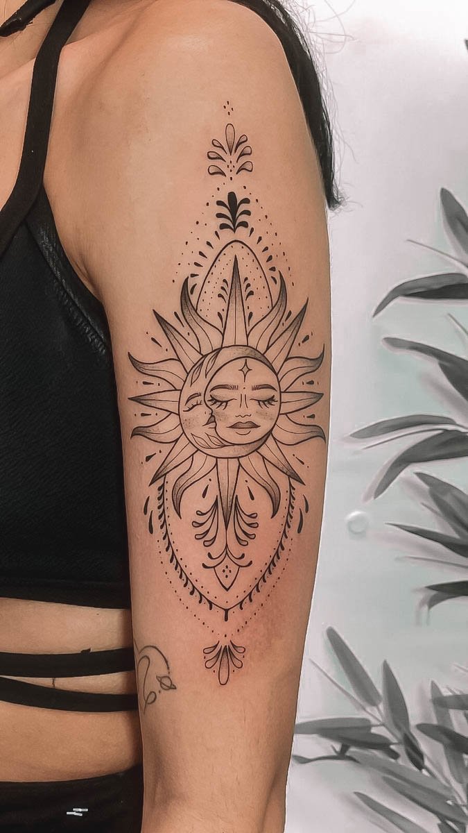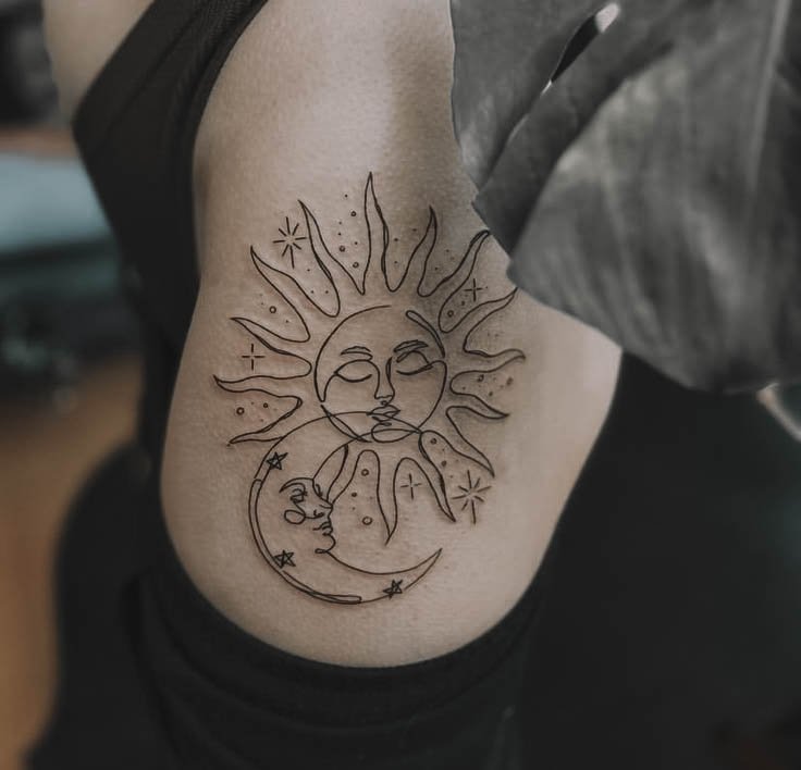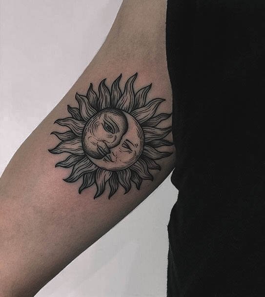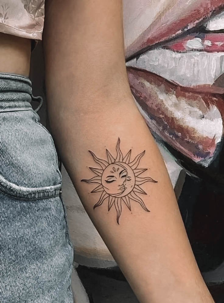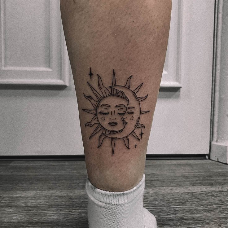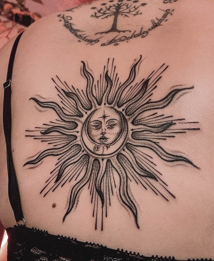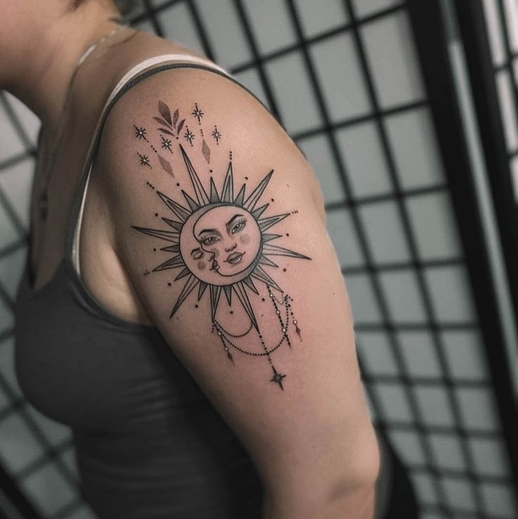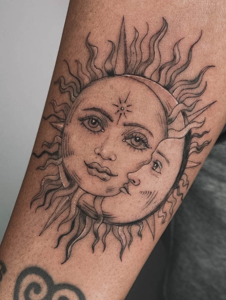 Татуировка с изображением Солнца и Луны символизирует единство противоположностей: света и тьмы, мужского и женского начала, дня и ночи.