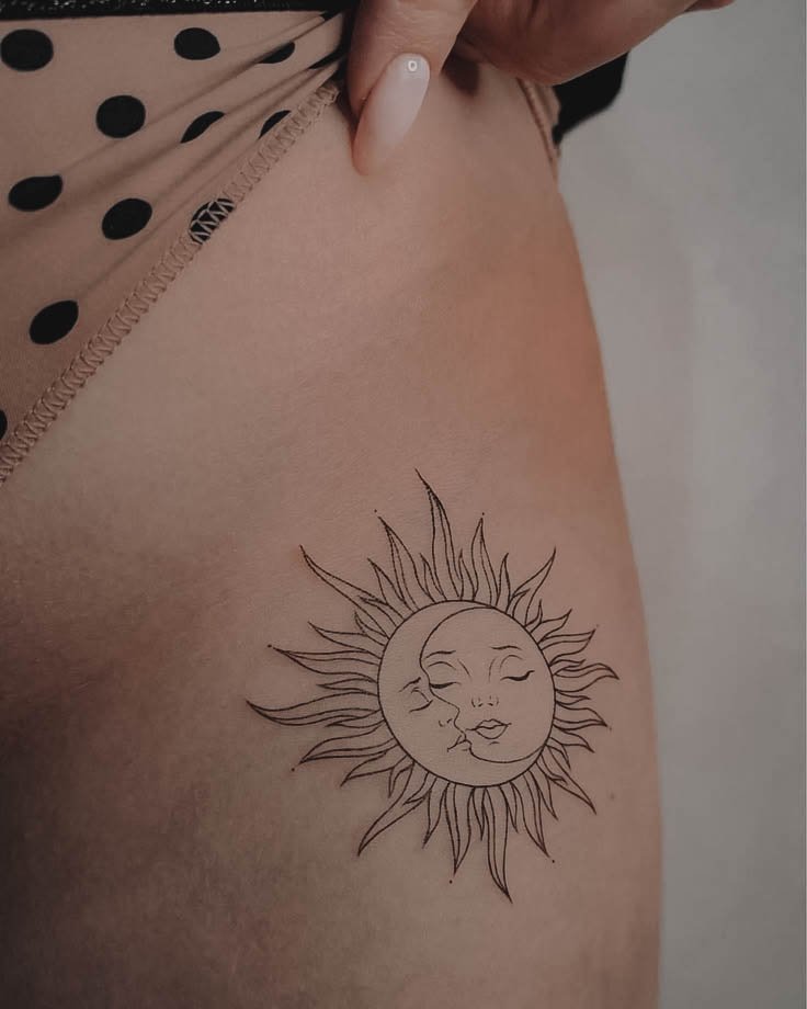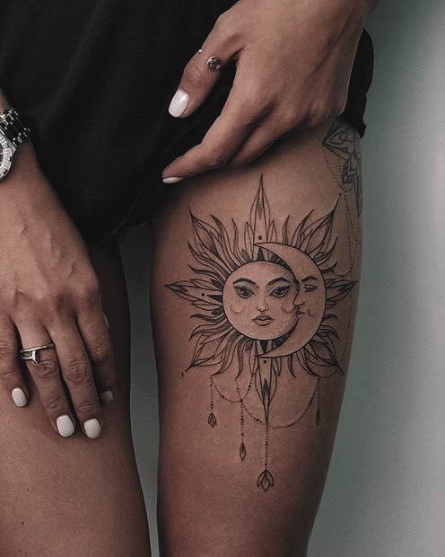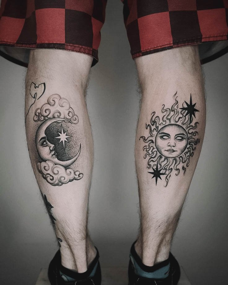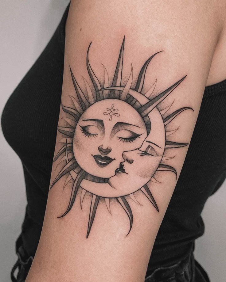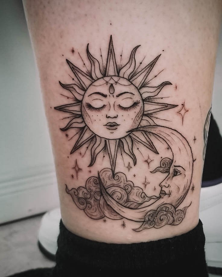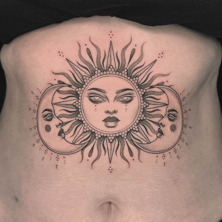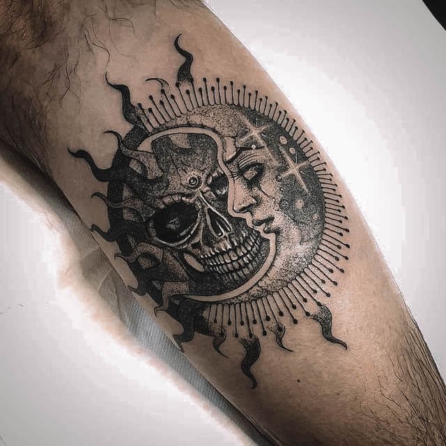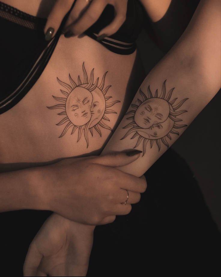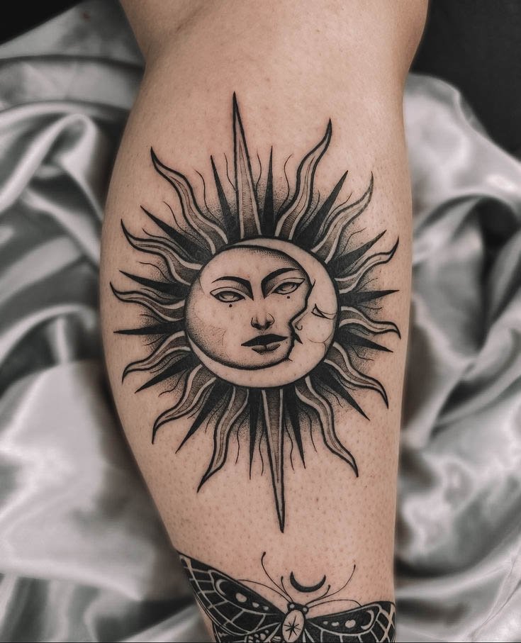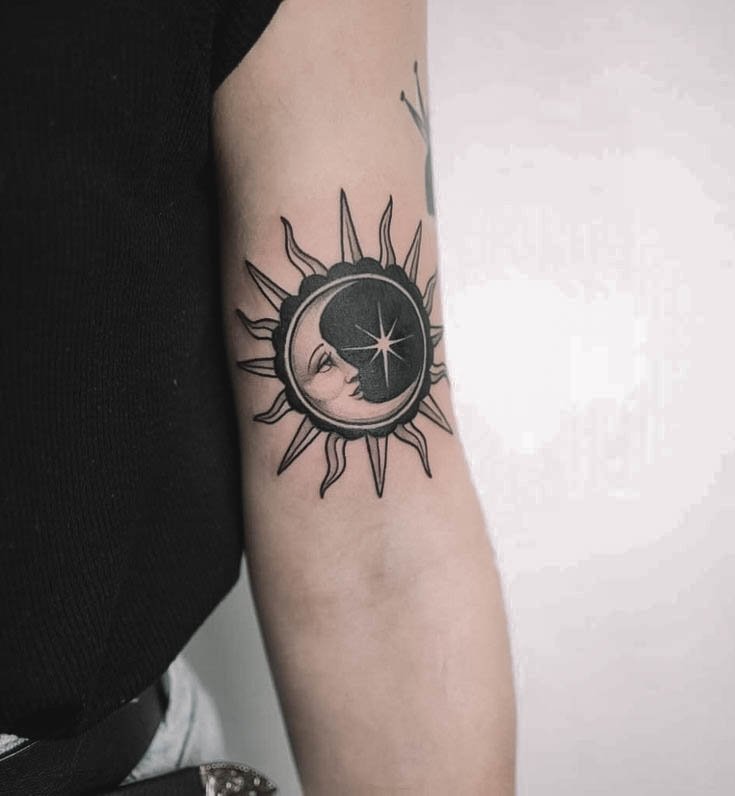 Татуировка с изображением Солнца и Луны символизирует единство противоположностей: света и тьмы, мужского и женского начала, дня и ночи.