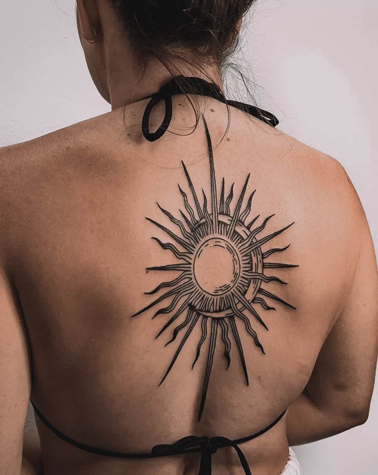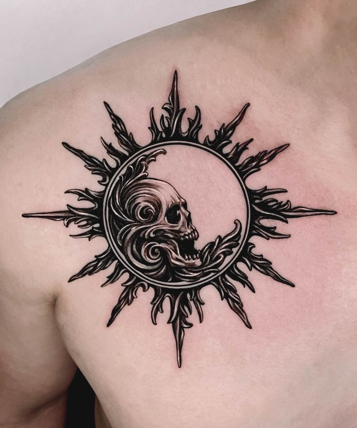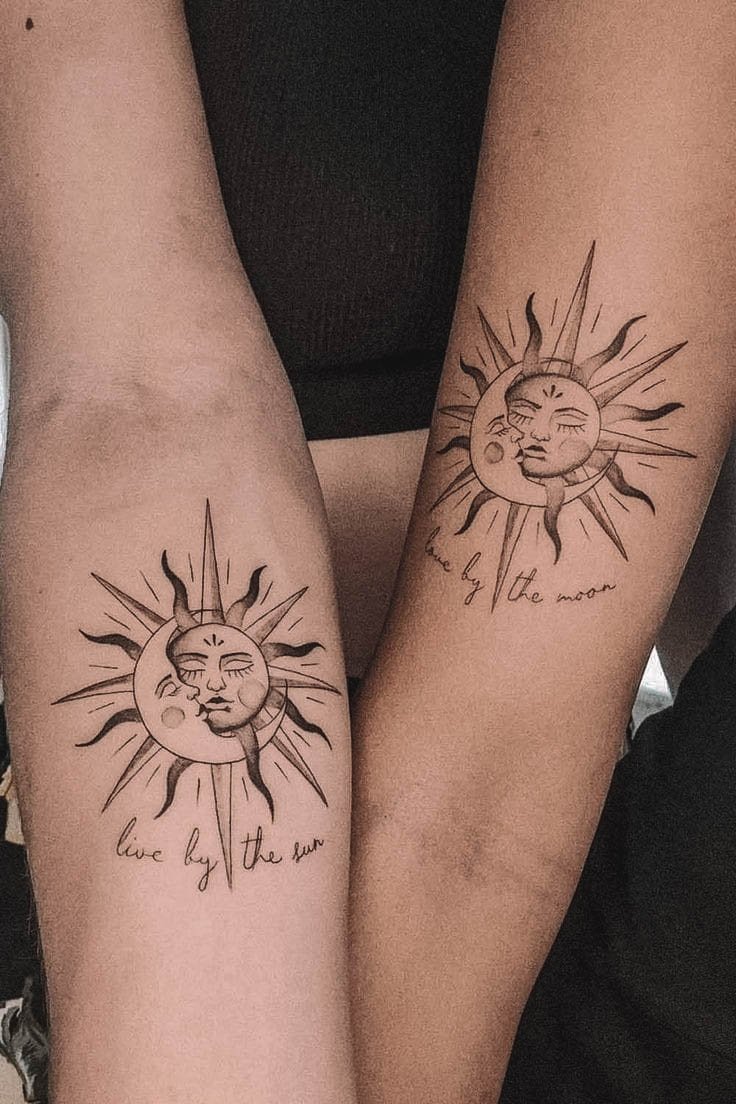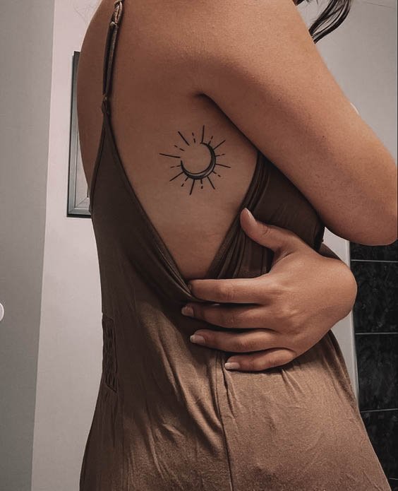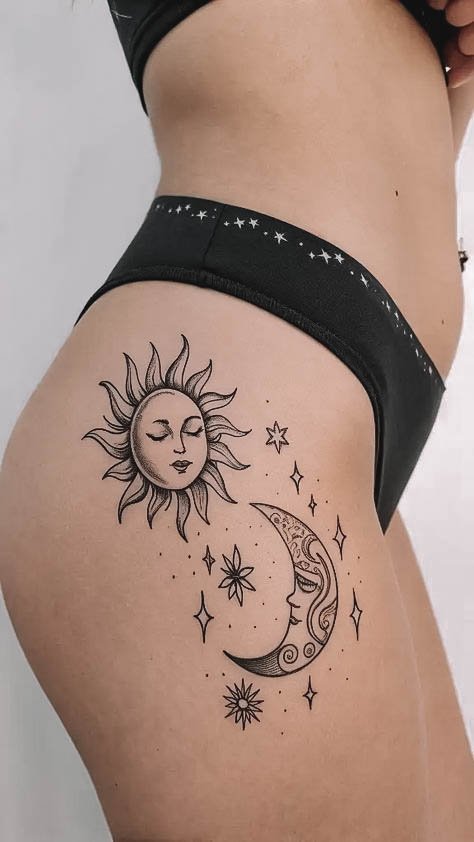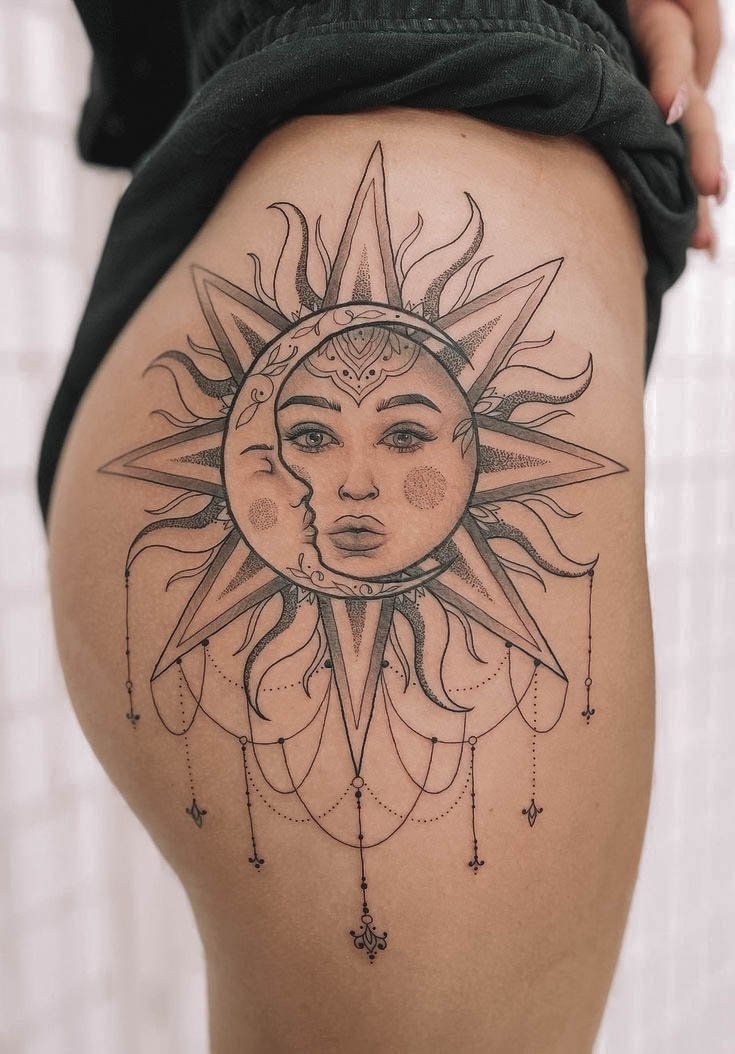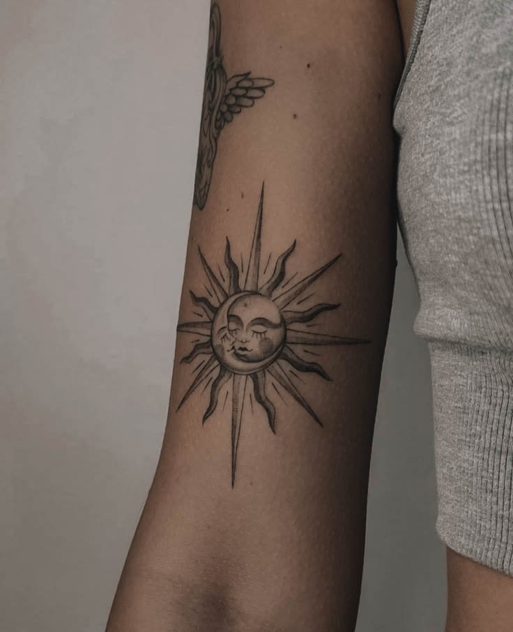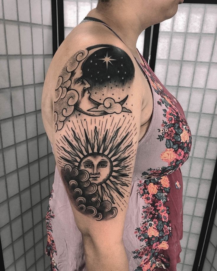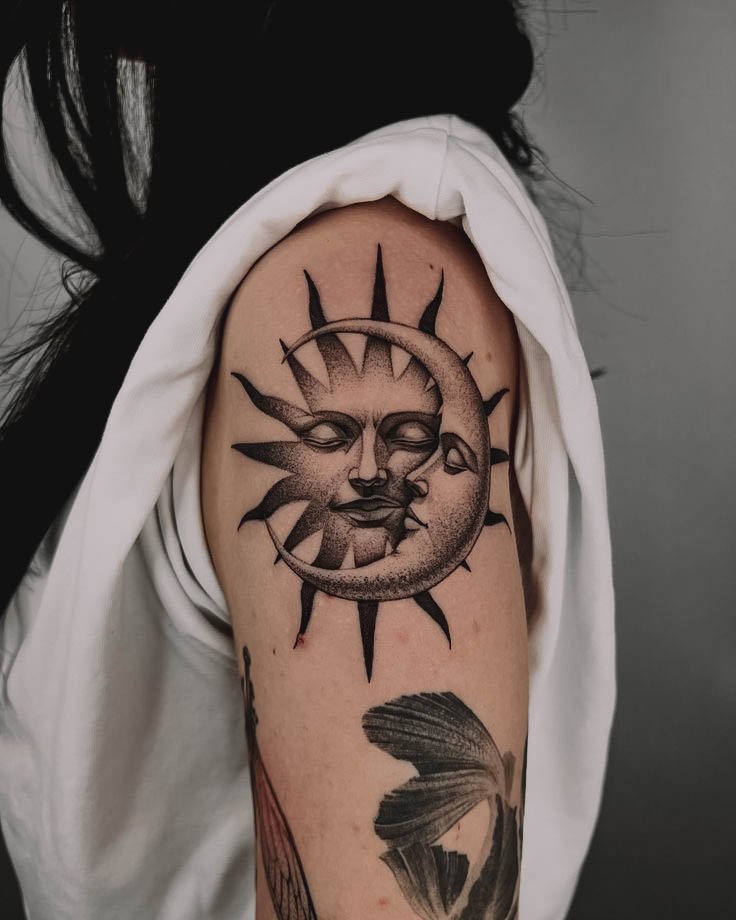Татуировка с изображением Солнца и Луны символизирует единство противоположностей: света и тьмы, мужского и женского начала, дня и ночи.