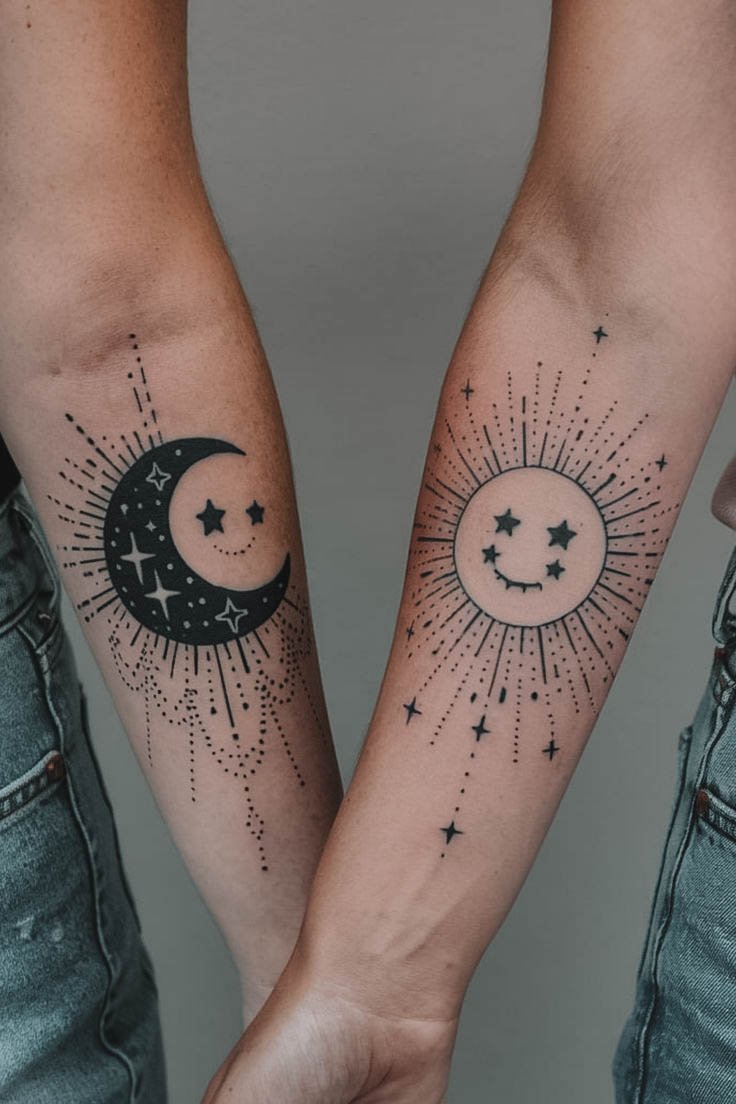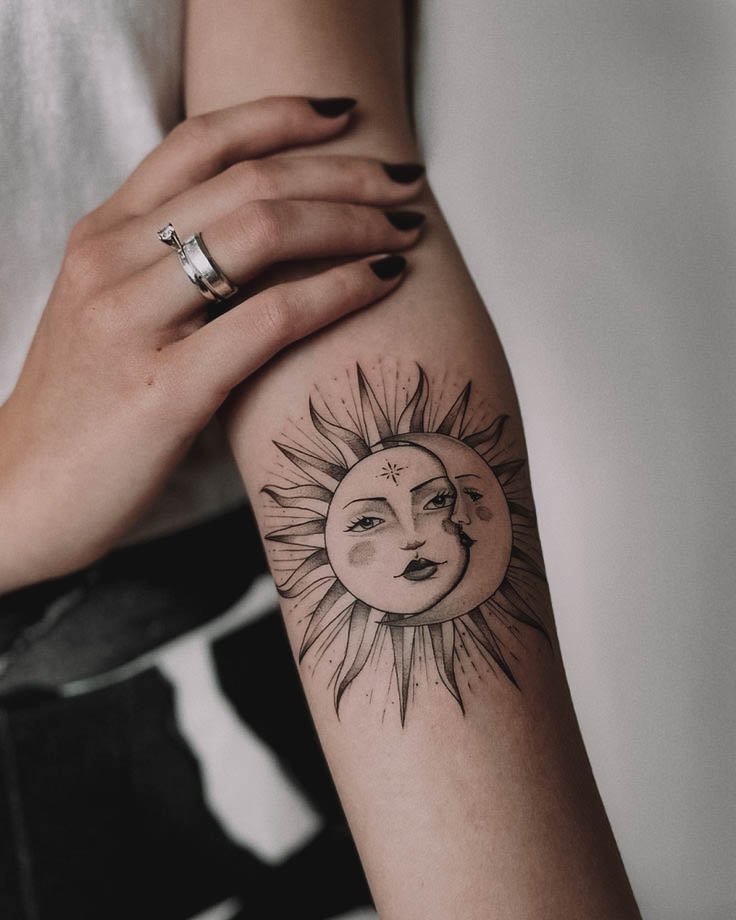 Татуировки с изображением солнца и луны могут быть выполнены в разных стилях: минимализм, реализм, геометрия, акварель или дотворк.