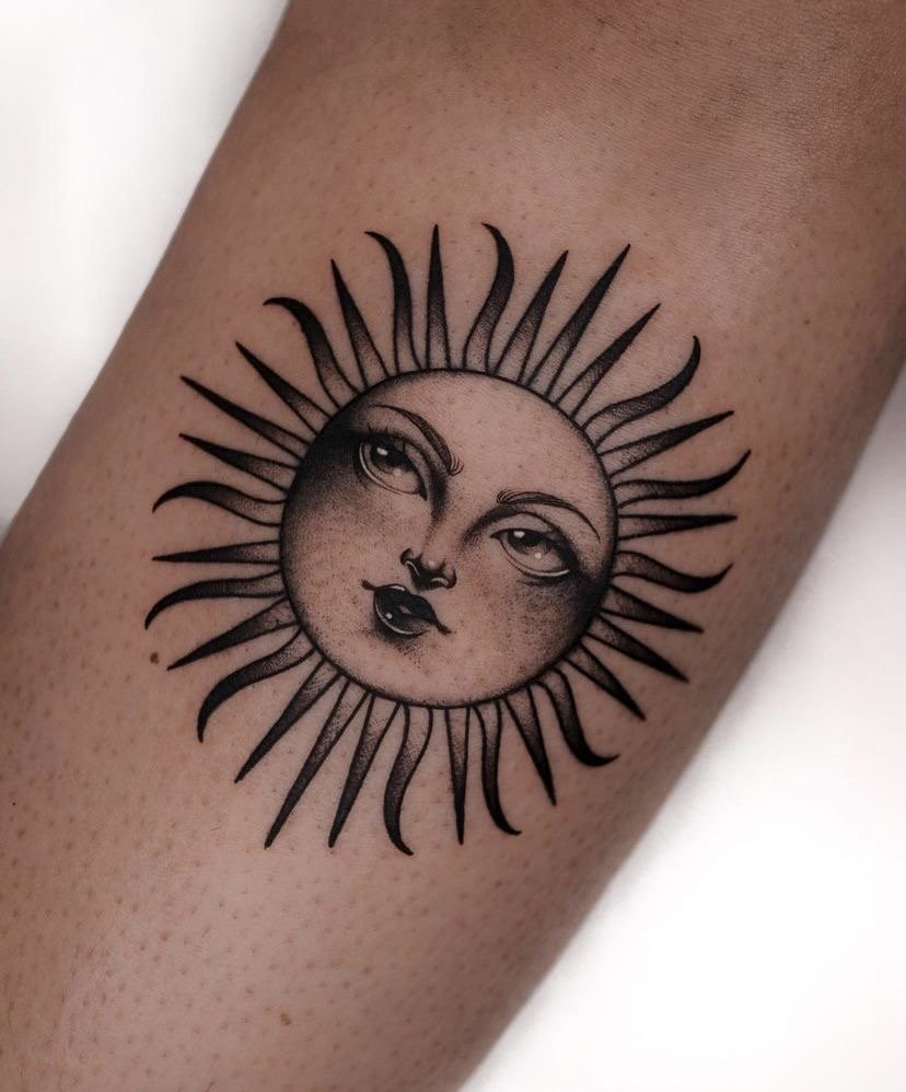 Татуировка солнца может быть выполнена в различных стилях, что влияет на её визуальное восприятие.