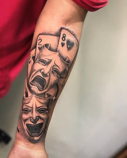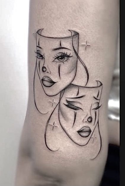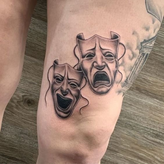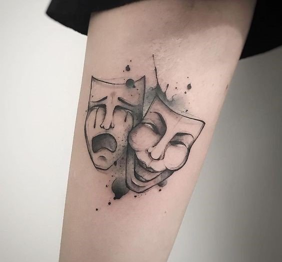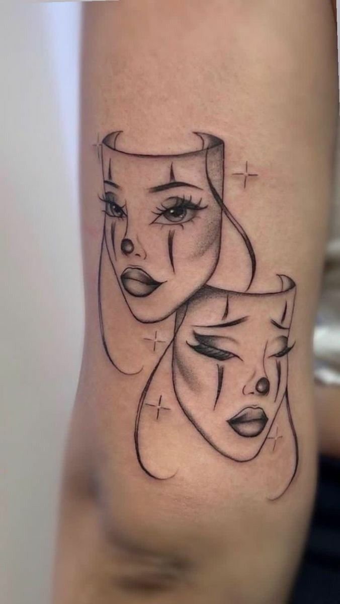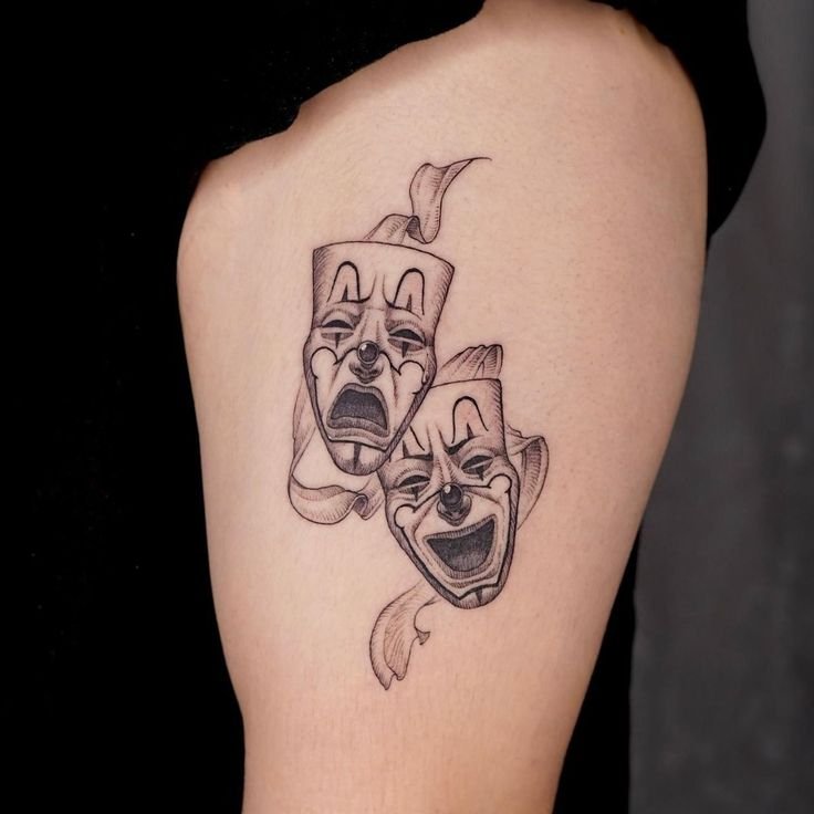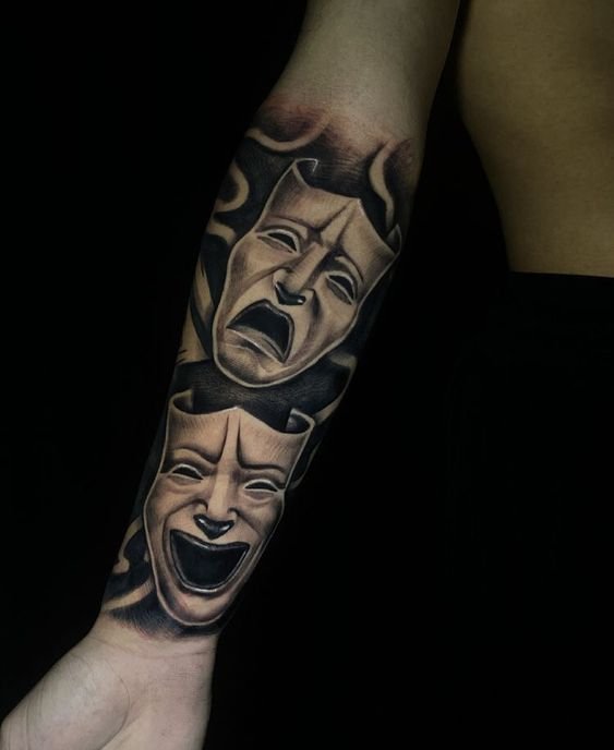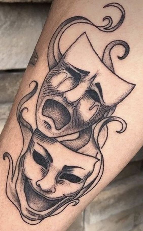 Эти образы берут свое начало в древнегреческом театре, где каждая маска представляла одну из сторон человеческой жизни: радость и горе, смех и слёзы. В контексте татуировок трагическая маска символизирует глубокие переживания, страдания и преодоление трудностей, показывая силу духа человека, способного справиться с жизненными вызовами. Комическая маска, напротив, воплощает веселье, радость и лёгкость, подчёркивая умение оставаться оптимистом в любых ситуациях.