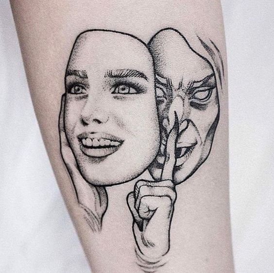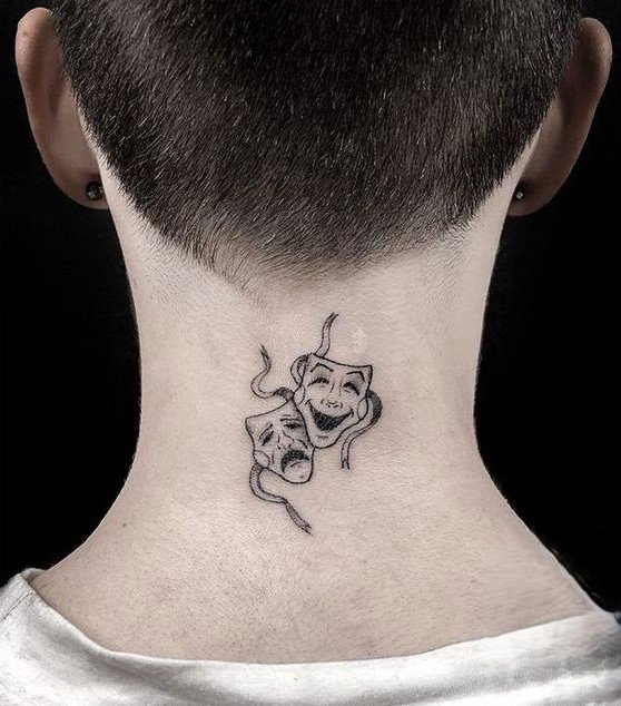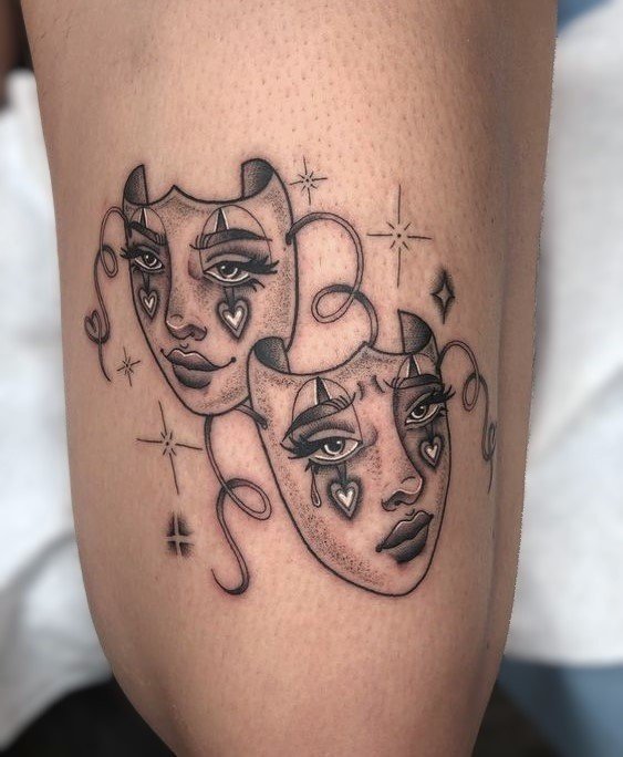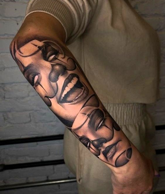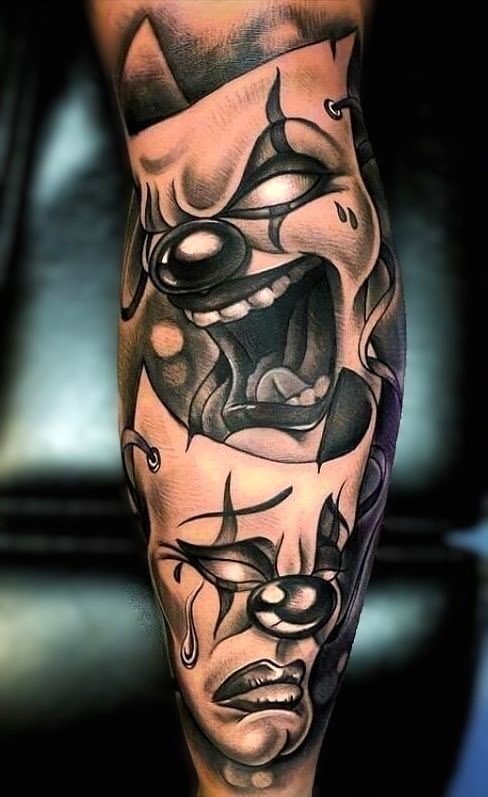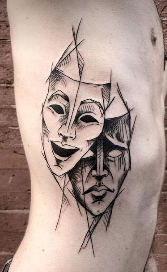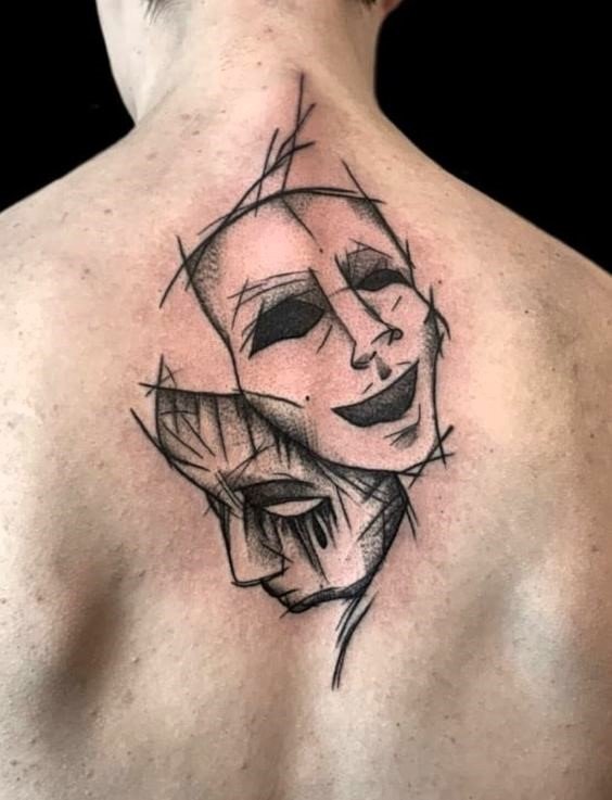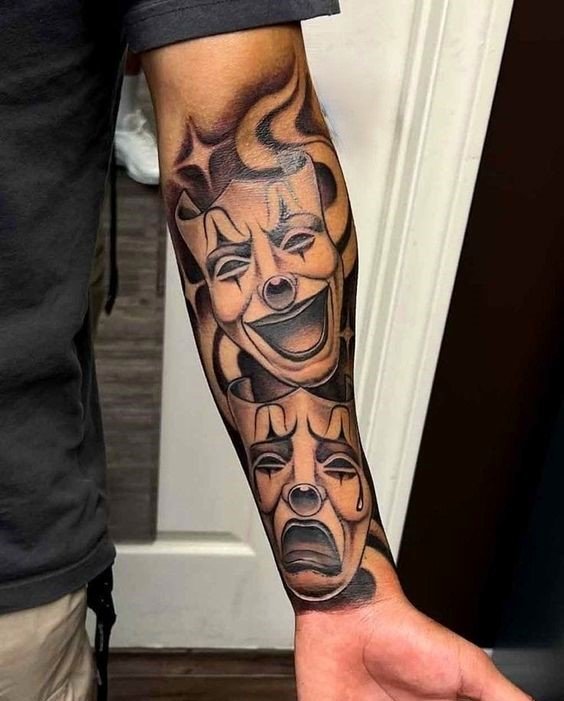 Эти образы берут свое начало в древнегреческом театре, где каждая маска представляла одну из сторон человеческой жизни: радость и горе, смех и слёзы. В контексте татуировок трагическая маска символизирует глубокие переживания, страдания и преодоление трудностей, показывая силу духа человека, способного справиться с жизненными вызовами. Комическая маска, напротив, воплощает веселье, радость и лёгкость, подчёркивая умение оставаться оптимистом в любых ситуациях.