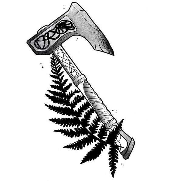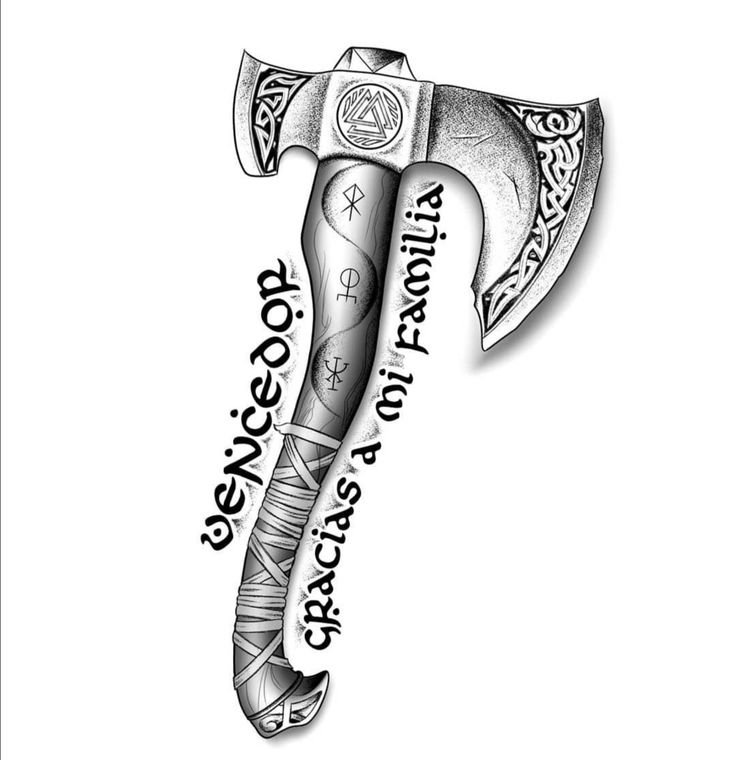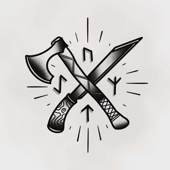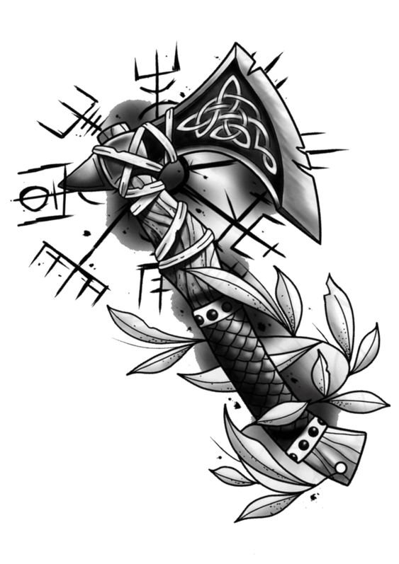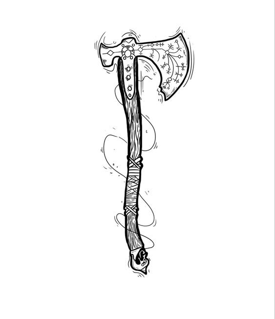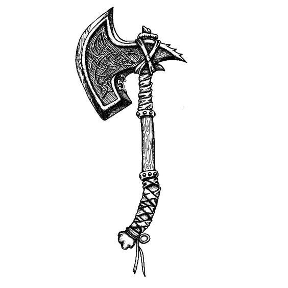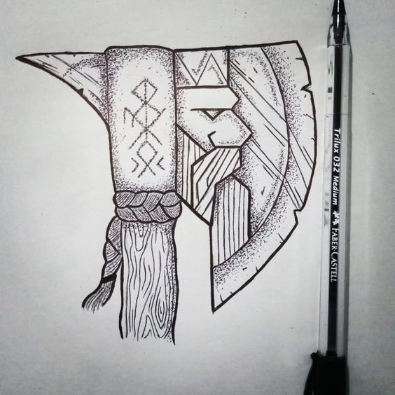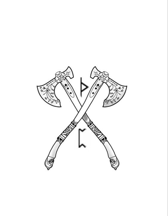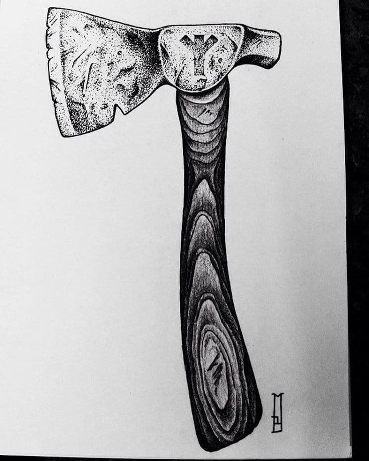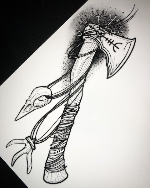 - Эскиз топора с парным количеством лезвий, либо тату с двумя топорами считается мощным оберегом.