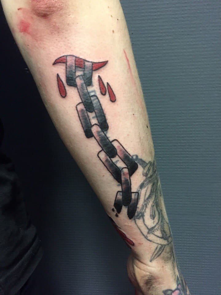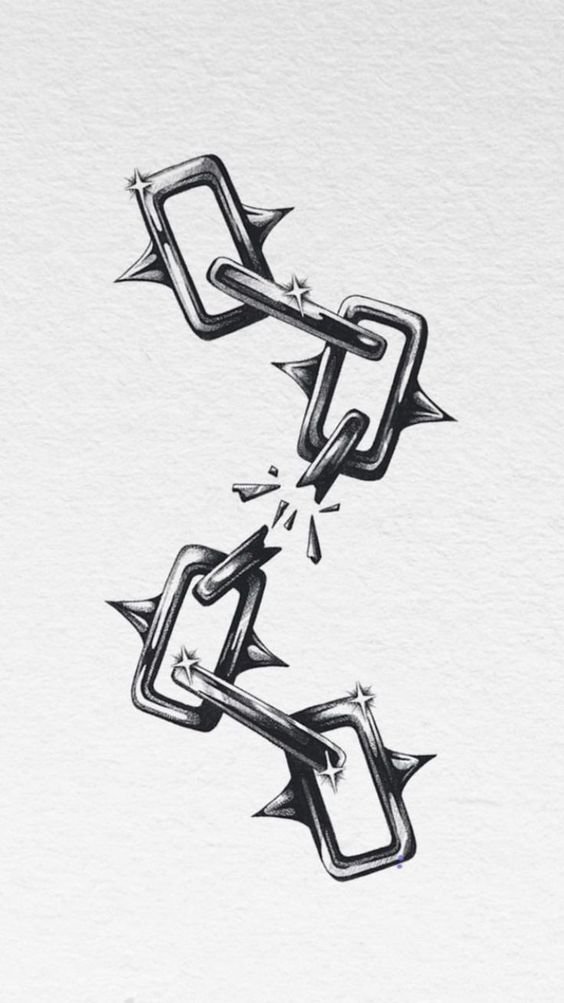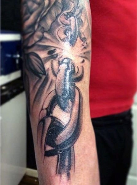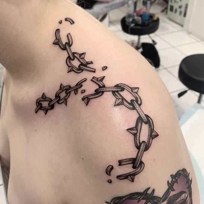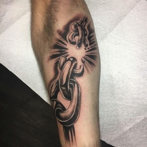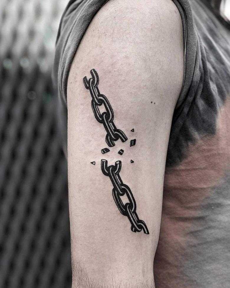 - Разорванная цепь в татуировке выступает знаком свободы. Таким изображением человек демонстрирует свою независимость, его мысли свободны, и он не прислушивается к мнению посторонних людей. Так же, при помощи данной татуировки человек говорит о том, что ранее был зависим, к примеру от пагубных привычек, и ему удалось освободиться.