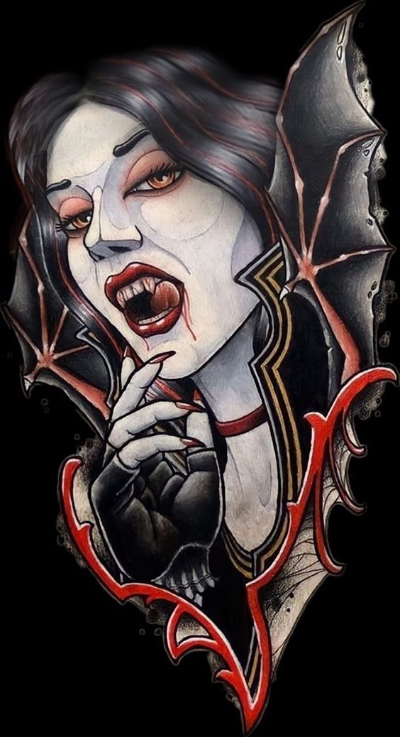 Удивительным будет следующее описание, которое абсолютно не схоже с предыдущими: обладатель тату вампир – человек творческий и преисполненный идей и фантазий. За счет того, что вампиры по легендам бессмертны до их уничтожения, у них есть множество времени для получения любой информации, которая будет сформирована в новый талант этого существа. По сказам они любят накапливать знания, чтобы еще более удачно вливаться в толпы людей и неприметно и безнаказанно там бесчинствовать.
