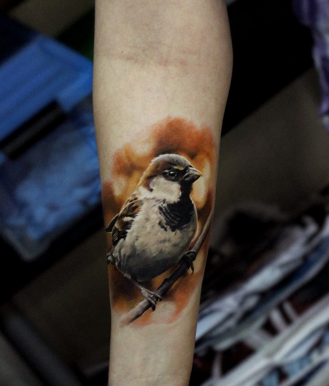 Татуировки с изображением воробья бывают самые разнообразные, начиная от черно-белой цветовой гаммы, заканчивая все возможными цветами.