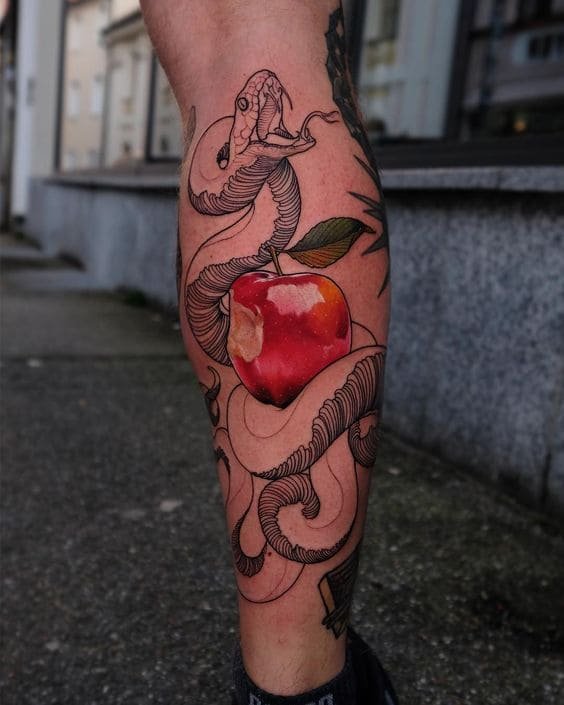 Однако, столь простой и распространенный фрукт, является довольно многозначным символом в индустрии художественной татуировки. С чем это связанно? Начнем пожалуй с самого начала, а именно с райского сада, в котором змей искуситель соблазном заставил Еву вкусить запретный плод.