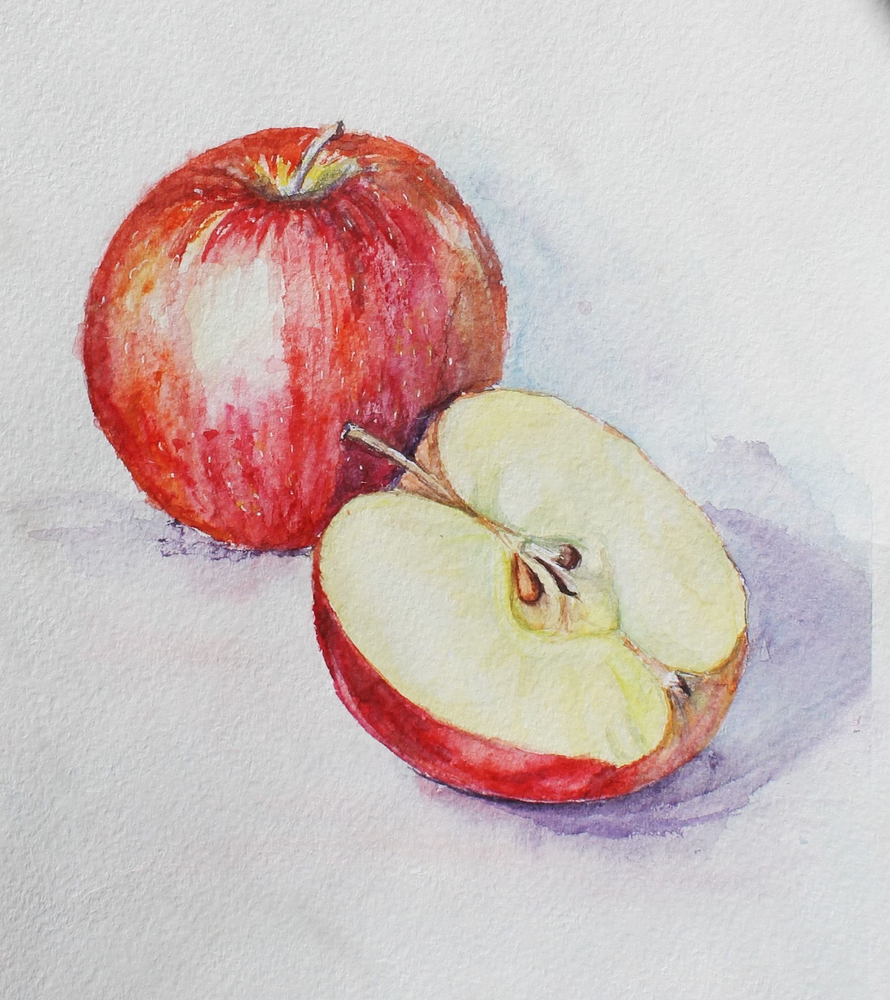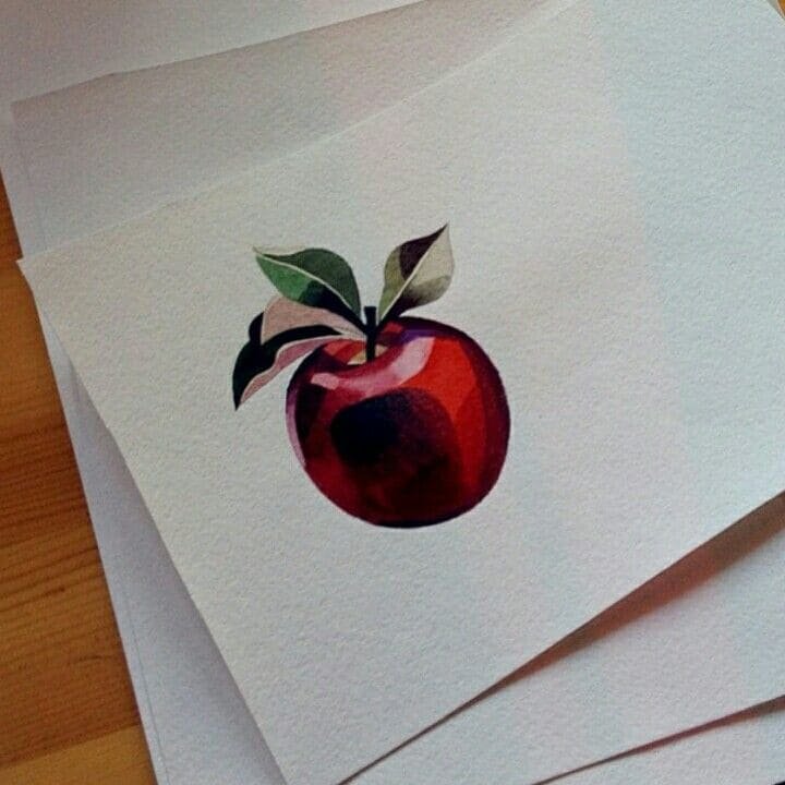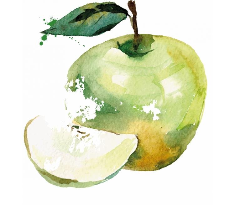 Акварель, потрясающий стиль, полон легкости и воздушности. Изображение яблока в данном стиле могут дополнять разводы от краски, либо разноцветные брызги.