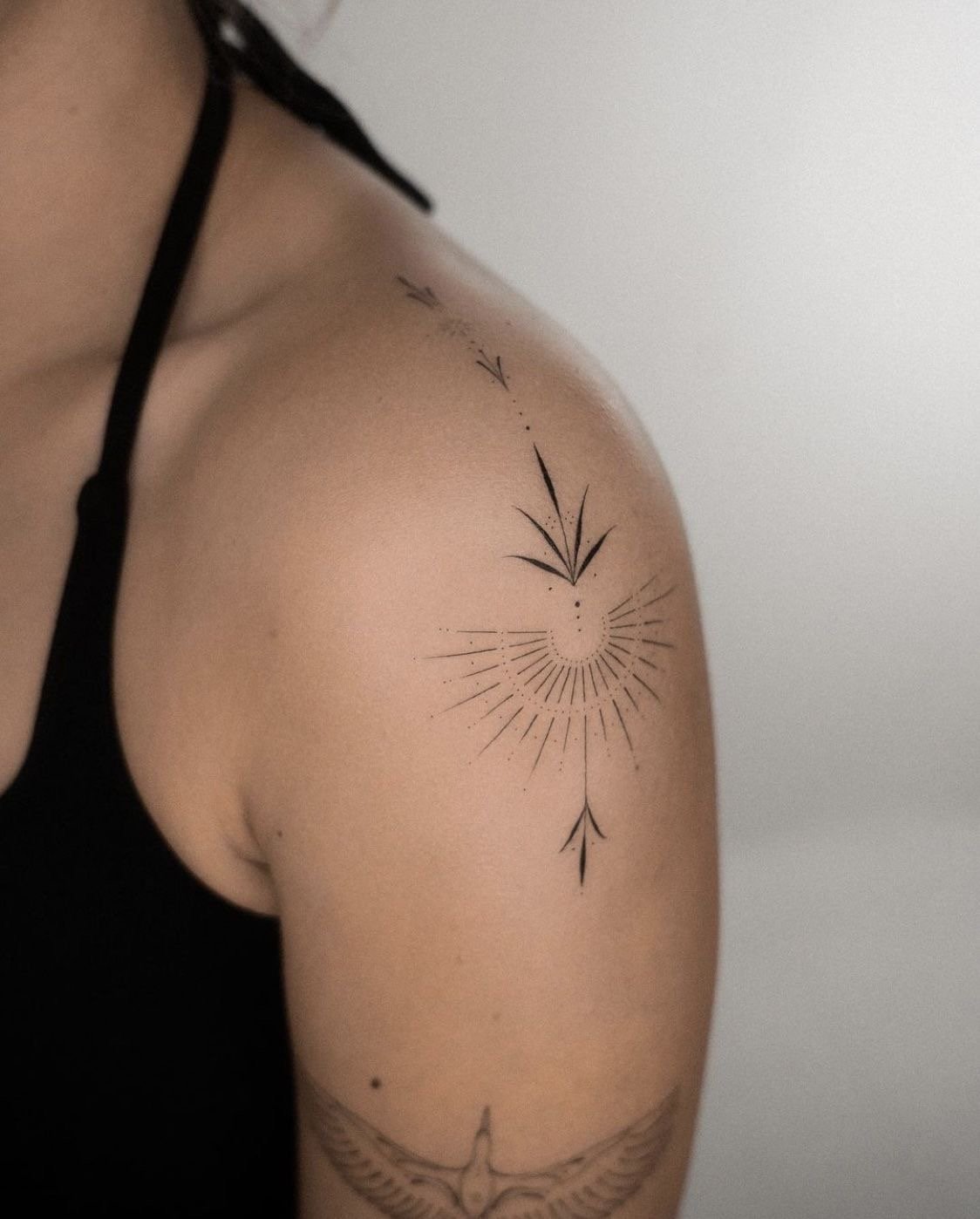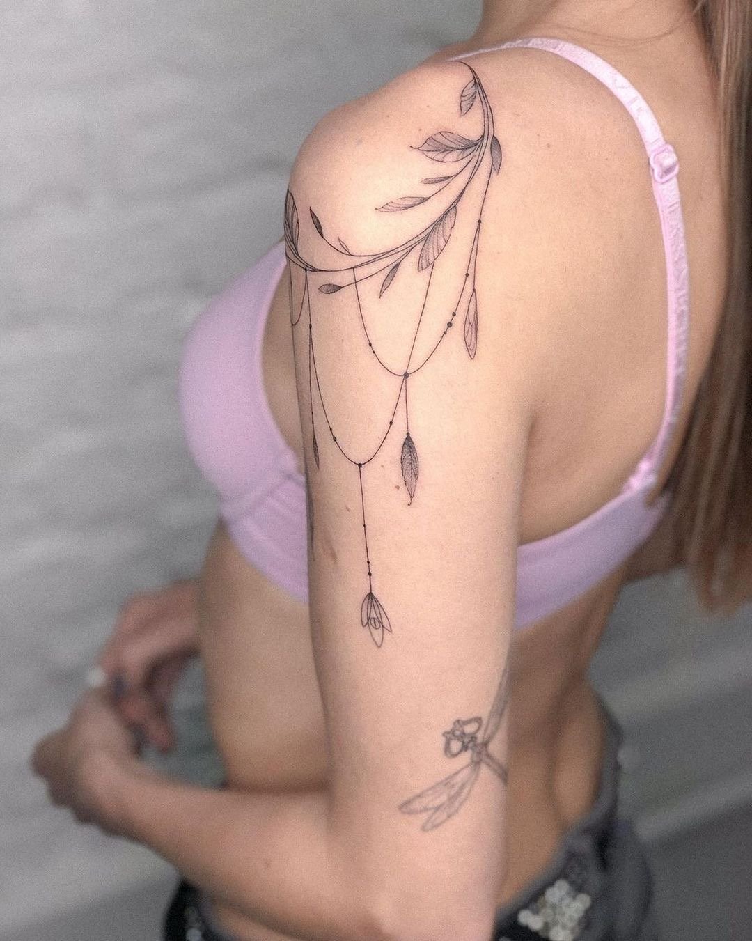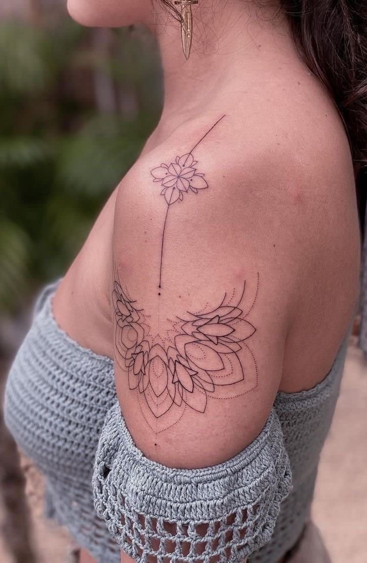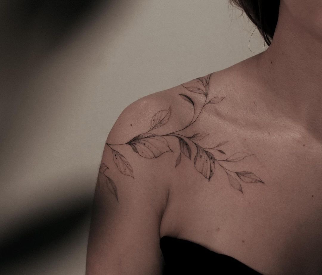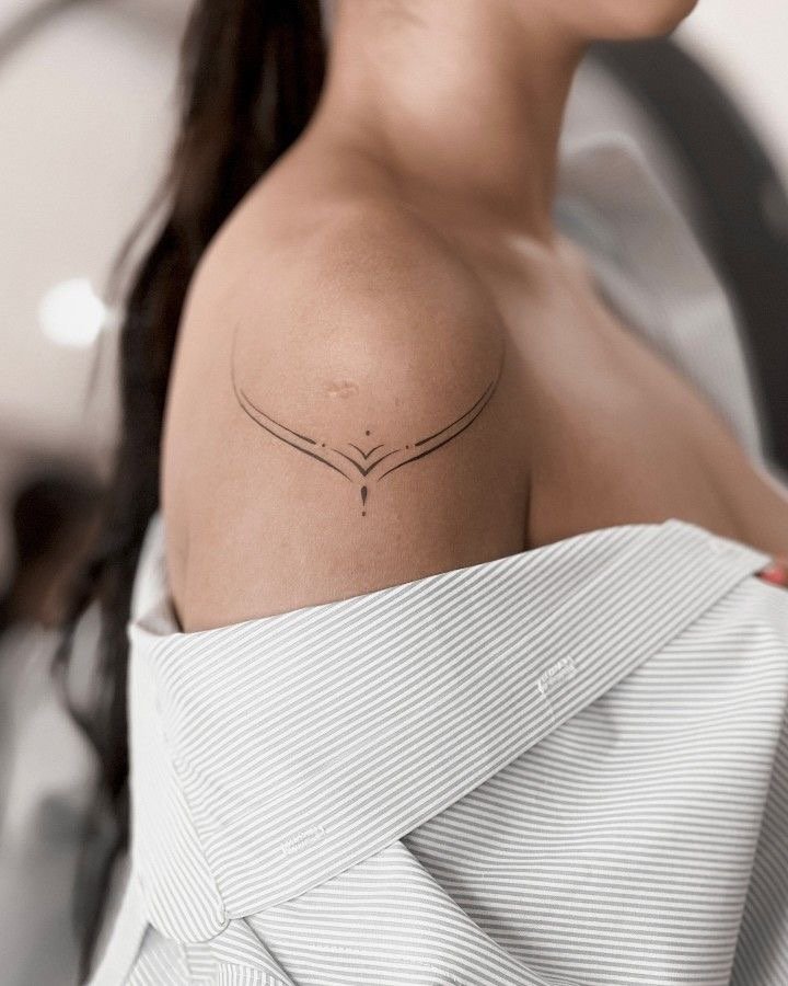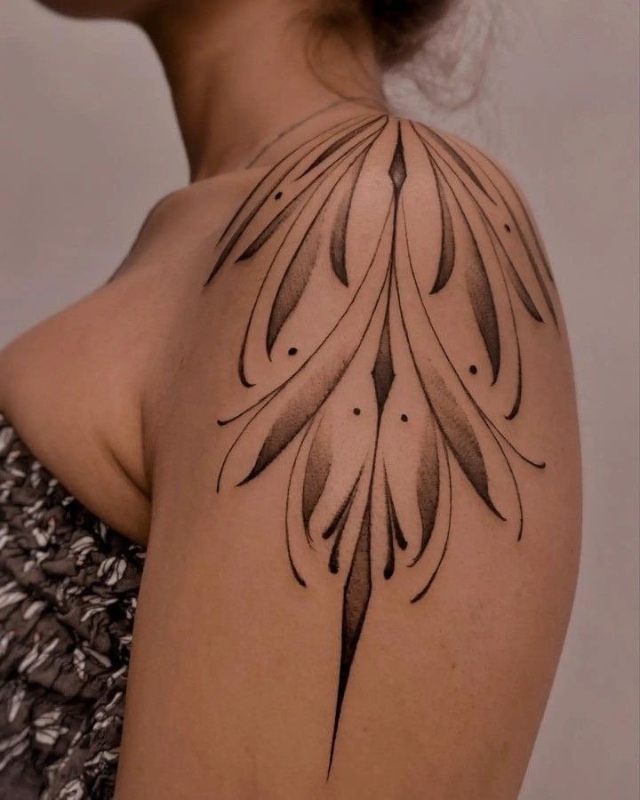 - Плече ідеально підходить для тату з м’якими вигинами чи симетричними формами, які гармонійно доповнять силует. Елемент може бути помітним або акуратно приховуватися під одягом.