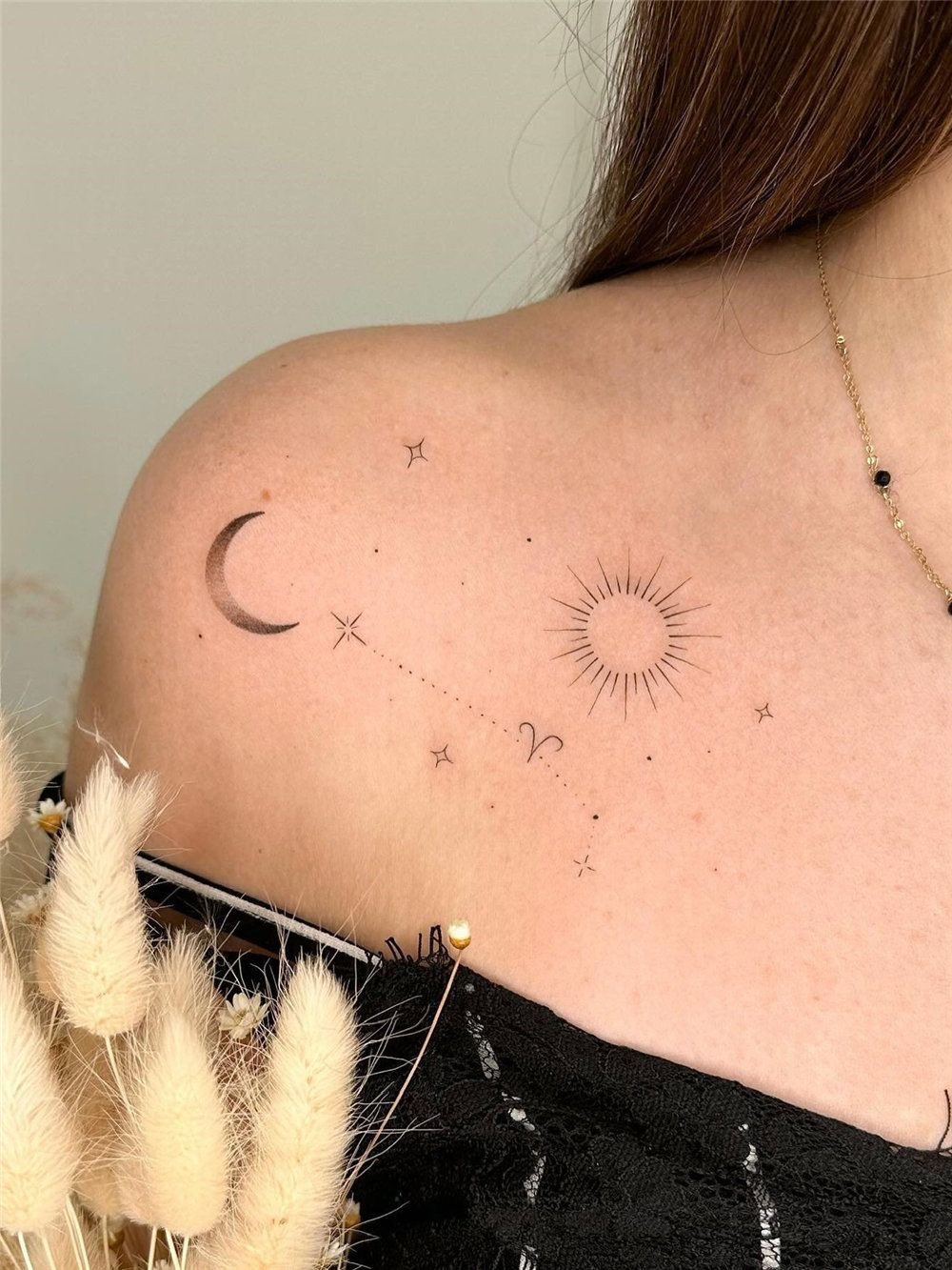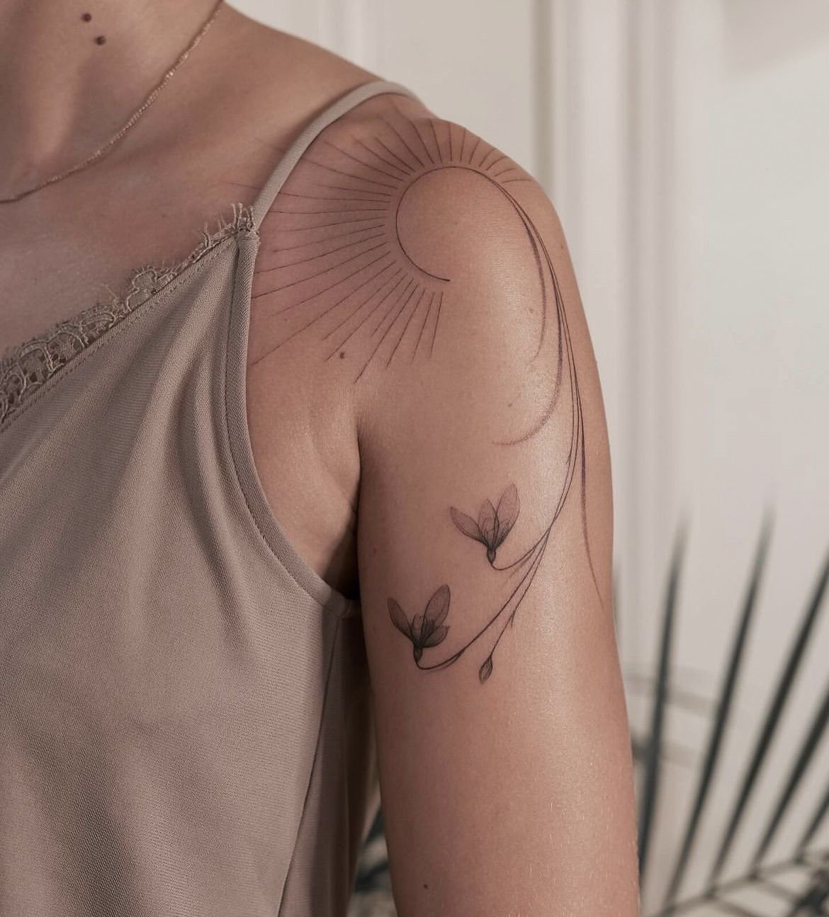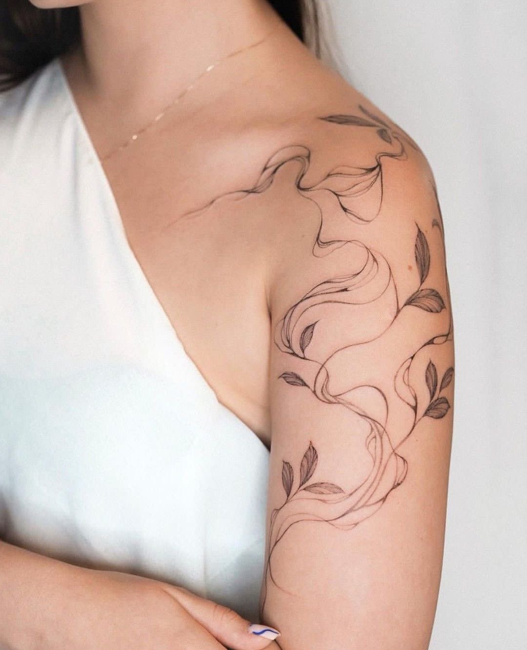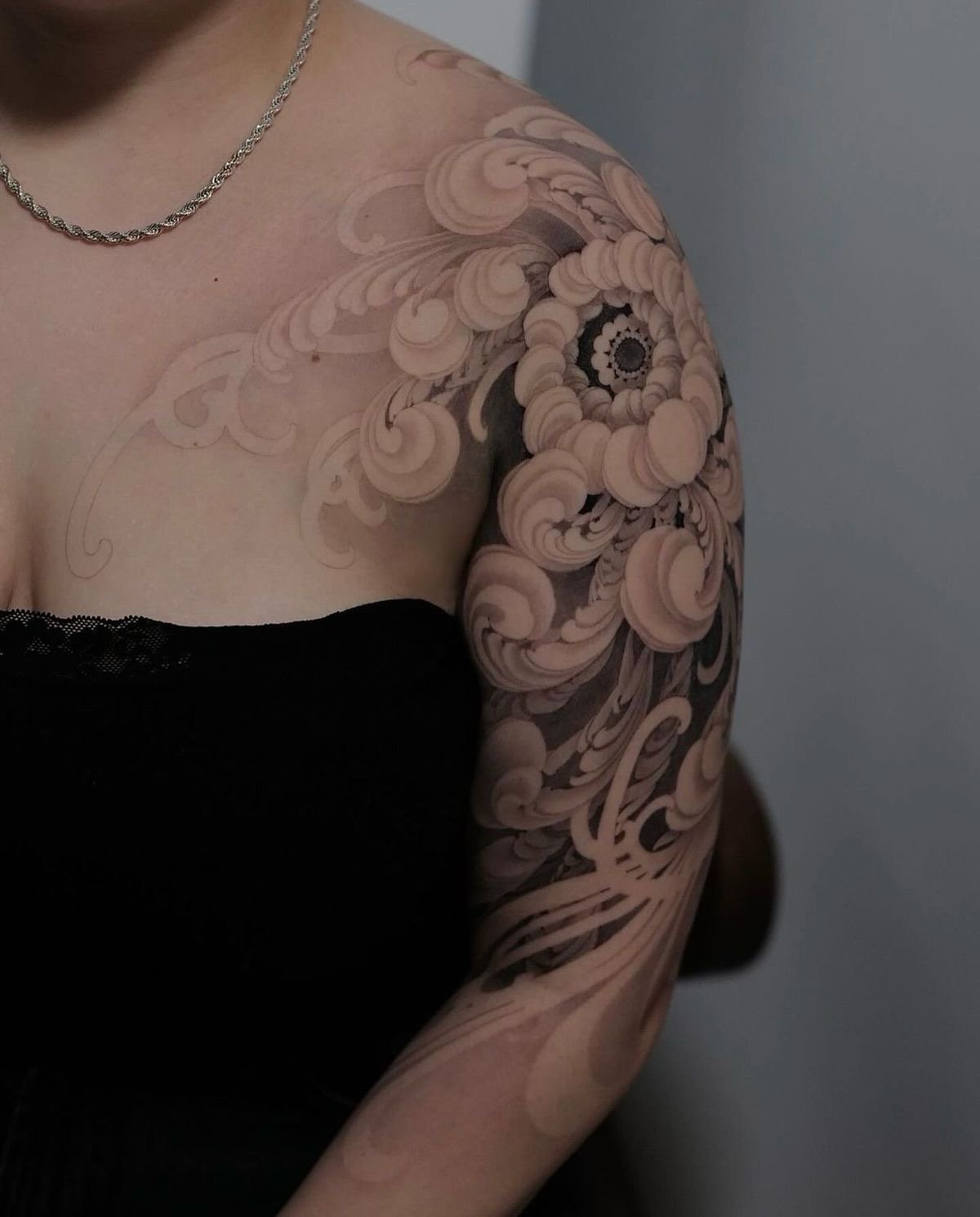 - Плече ідеально підходить для тату з м’якими вигинами чи симетричними формами, які гармонійно доповнять силует. Елемент може бути помітним або акуратно приховуватися під одягом.