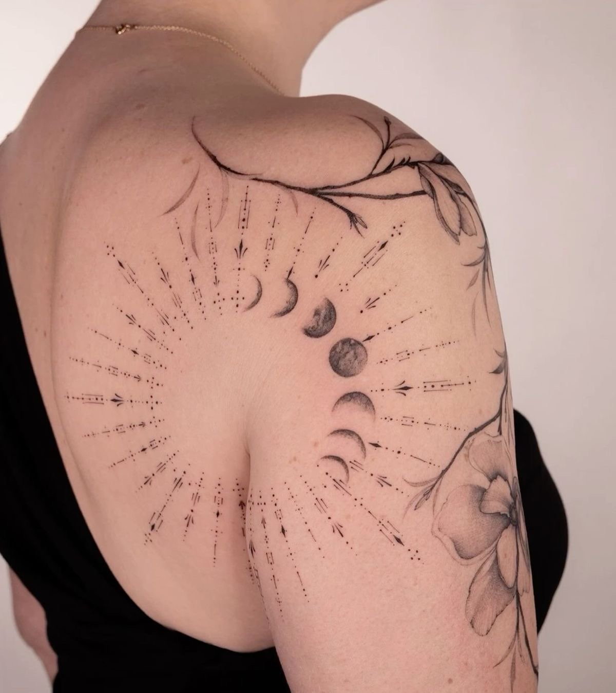 Плече – універсальна зона, яка підходить для найрізноманітніших ідей: від витончених ліній і невеликих символів до яскравих і виразних композицій. Такий елемент може бути як стриманим доповненням, так і центральним акцентом у образі.